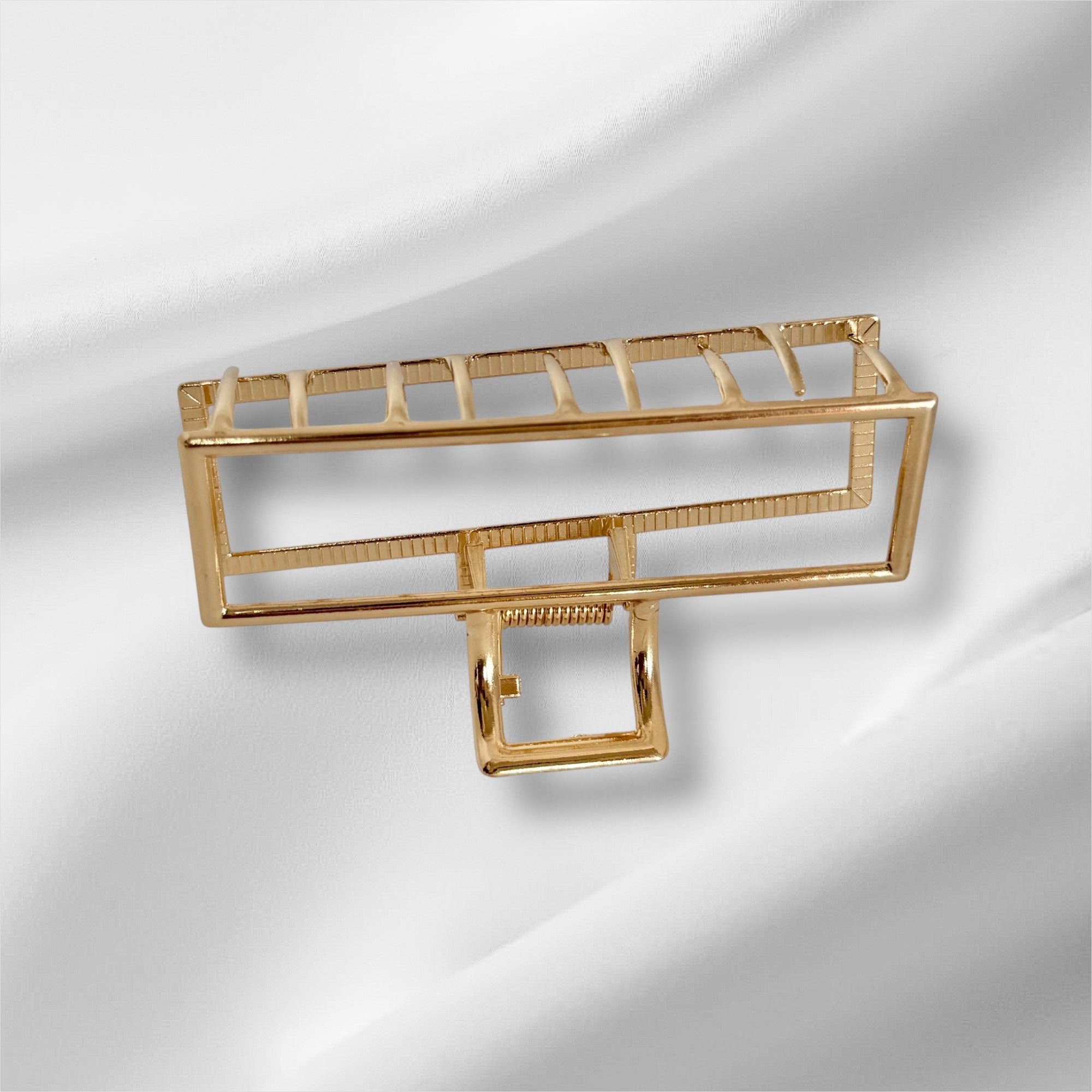 Crafted from zinc alloy and coated with a luminous gold finish, its open rectangular design offers a sleek yet secure hold for all hair types.