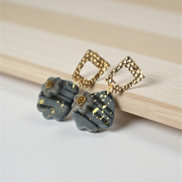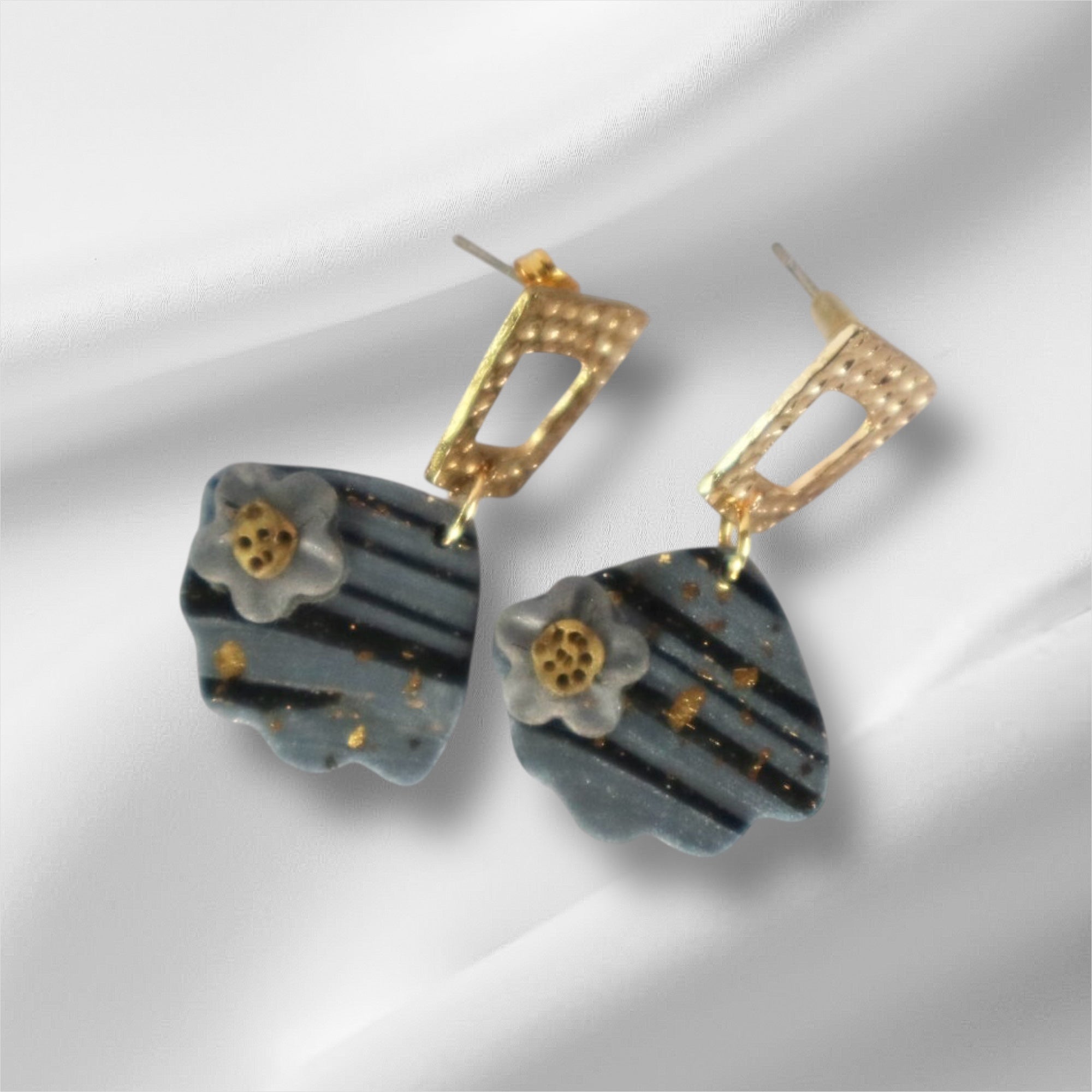 Graceful and feminine, these handmade earrings feature a delicate grey flower design sculpted from Sculpey polymer clay, highlighted with a soft touch of gold for a subtle, sophisticated shimmer. Each petal is carefully shaped by hand, making every pair truly one of a kind.