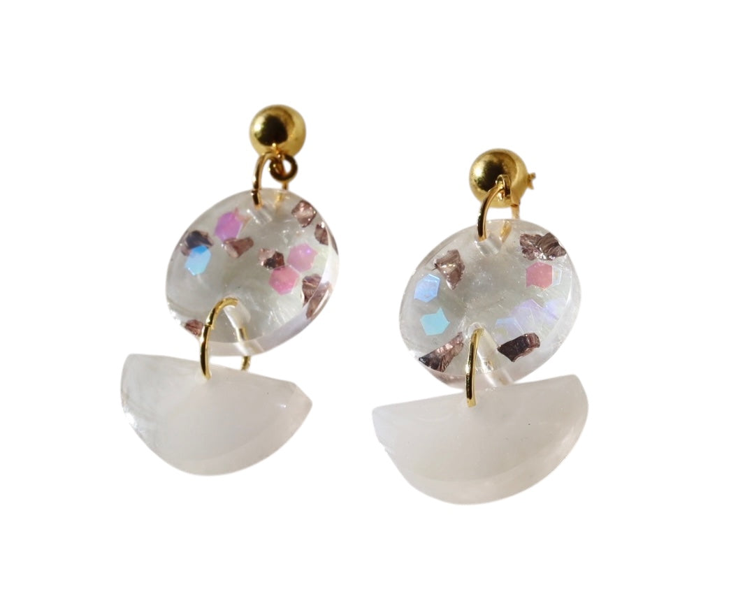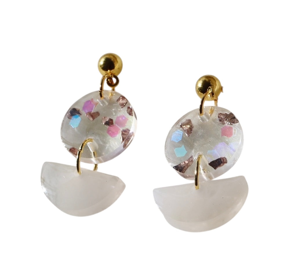 Handmade epoxy resin earrings featuring a soft, translucent finish with embedded decorative stone accents for subtle sparkle. Designed with stainless steel studs for comfortable everyday wear, this lightweight pair adds an elegant, modern touch to both casual and dressy looks.