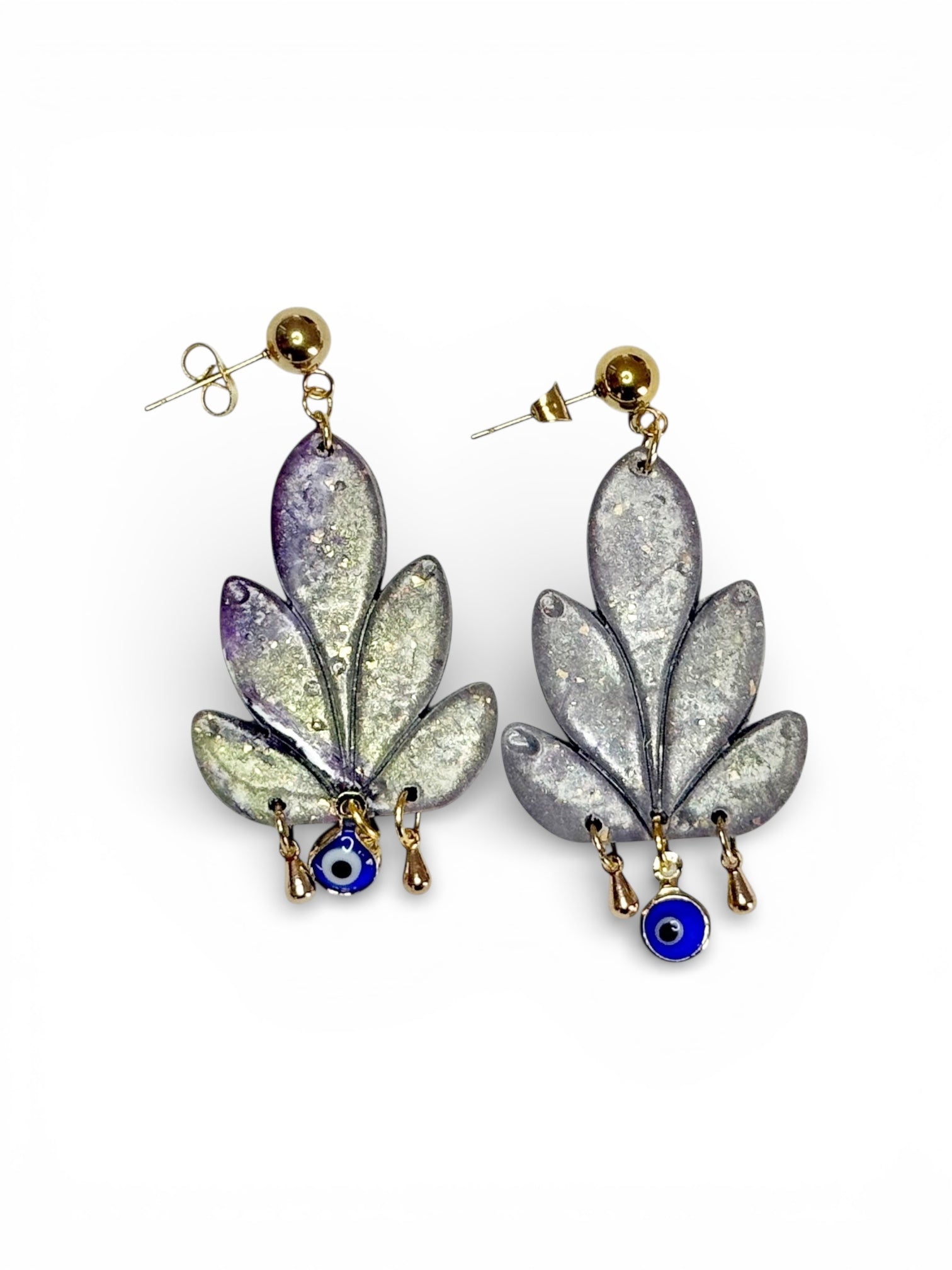Harmonize nature and protection with these handmade medium-sized polymer clay earrings, sculpted in leafy forms and adorned with stainless steel blue evil eye pendants and delicate bell charms, anchored by gold-filled stainless steel studs.