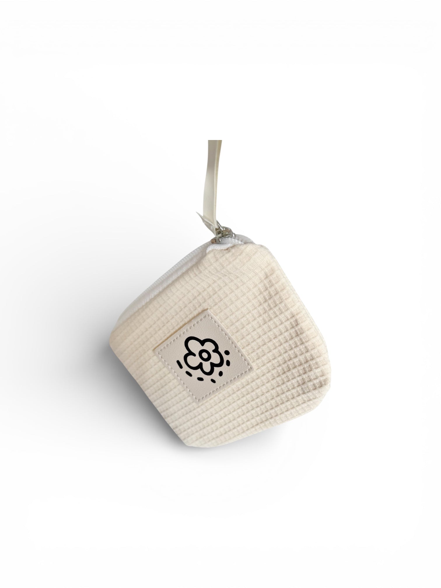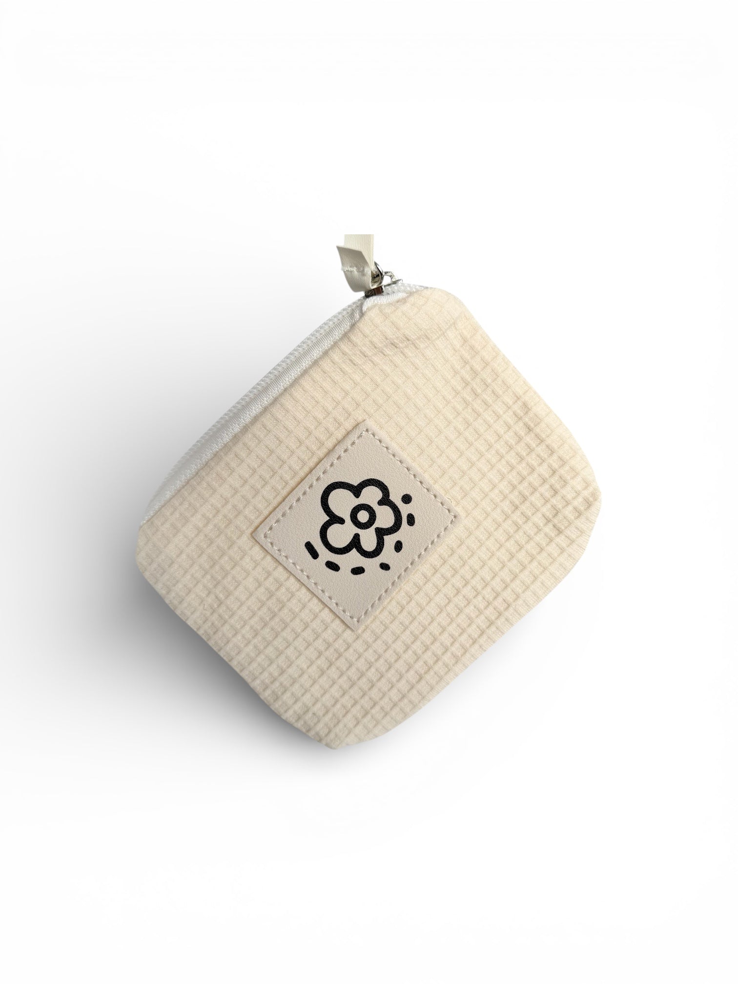 The Cloud Waffle pouch captures the beauty of soft minimalism with its creamy white waffle-textured fabric and playful floral patch detail. Compact yet roomy, it’s perfect for storing makeup, travel essentials, or everyday trinkets.