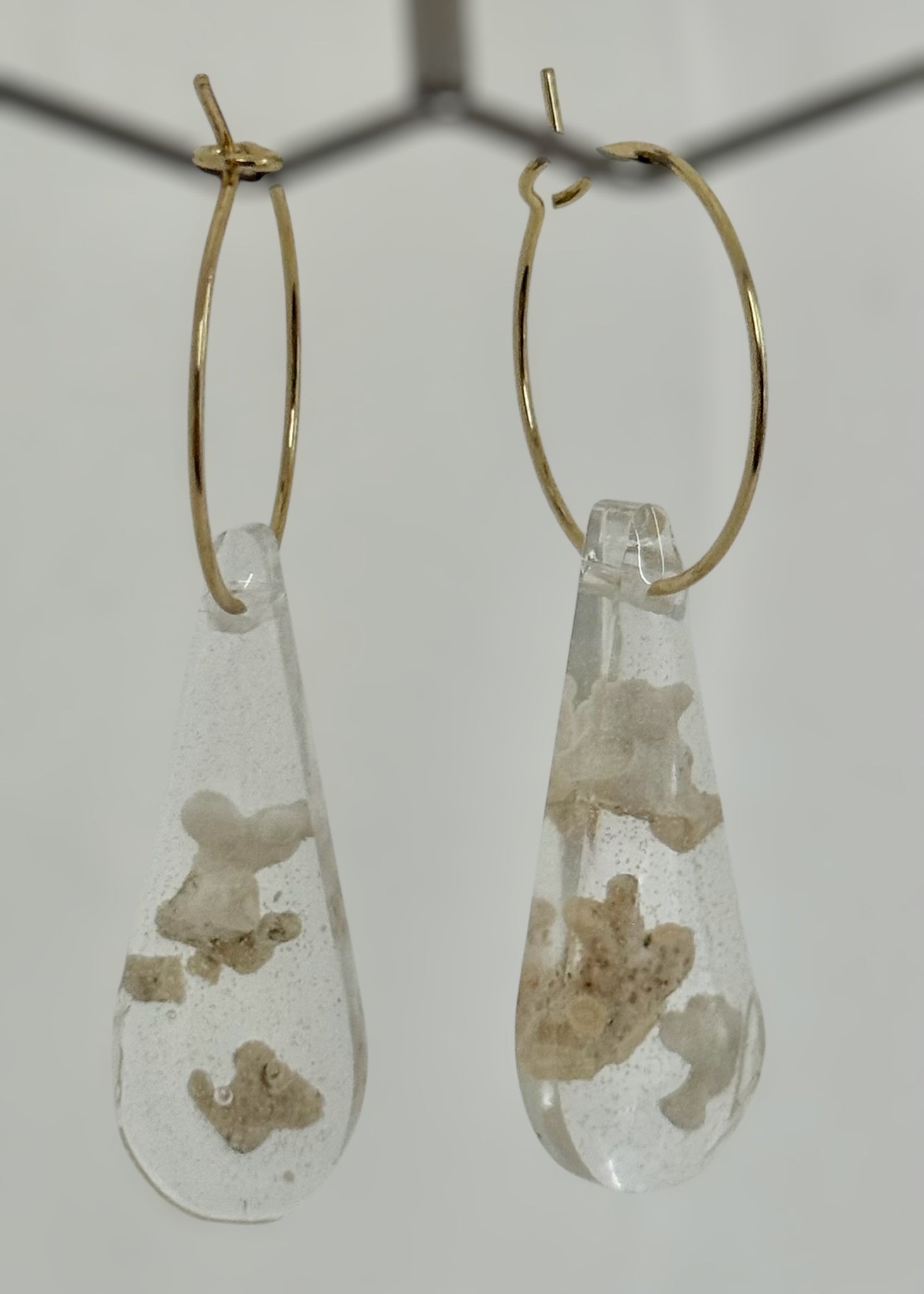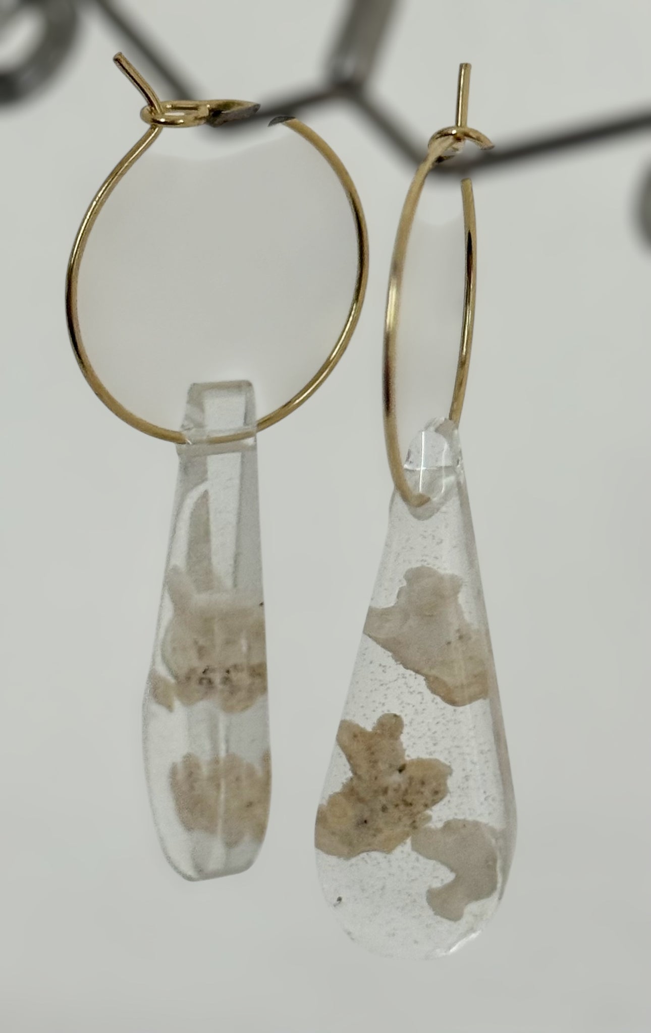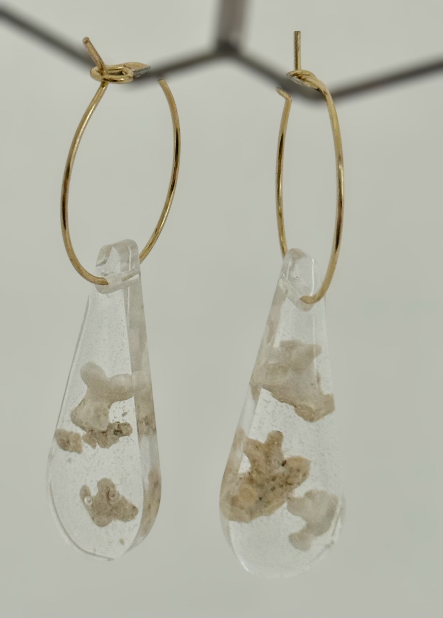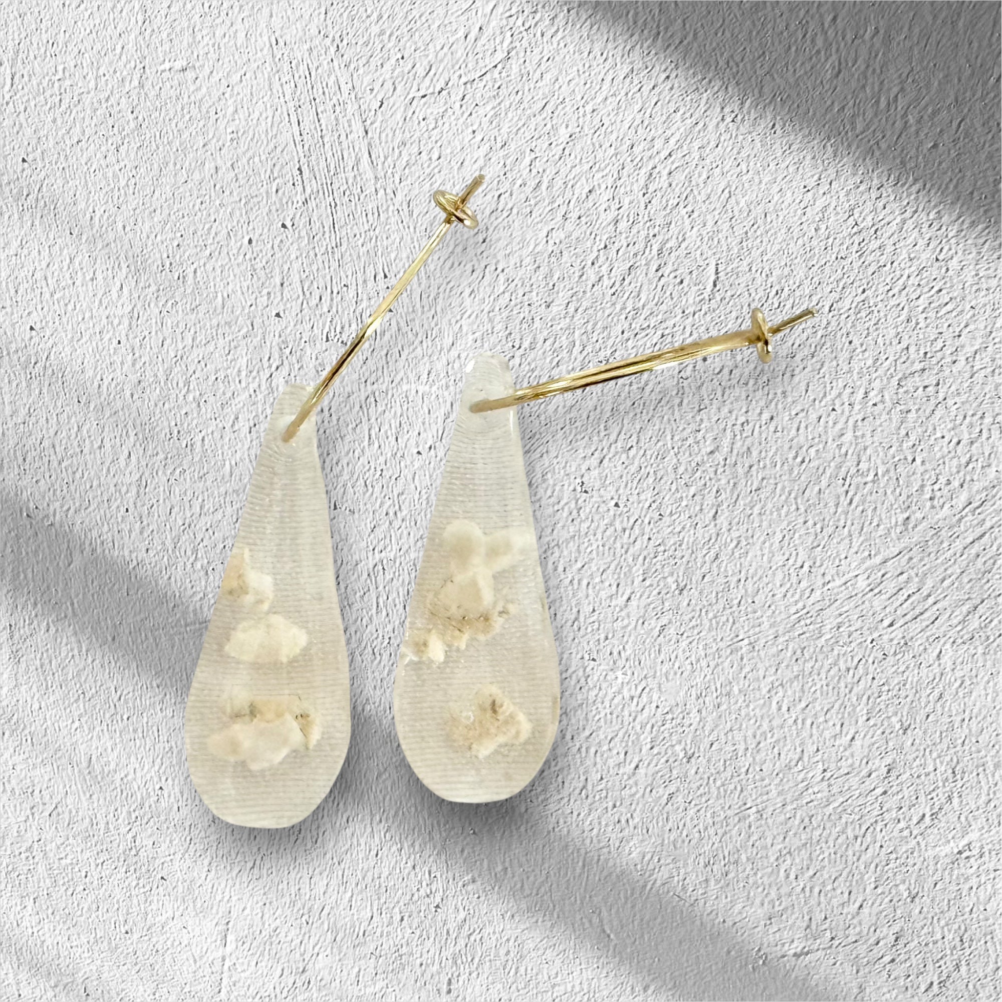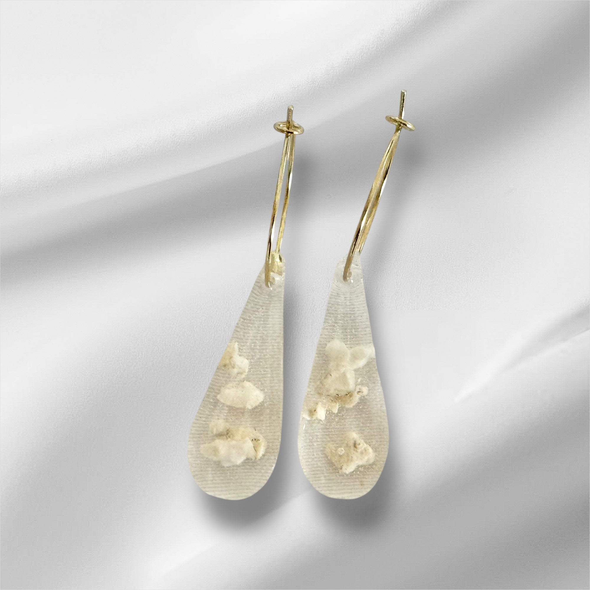 Description: Immerse yourself in coastal elegance with these handmade stainless steel hoop earrings, featuring real white coral personally handpicked from Coromandel Beach and preserved in glossy resin.