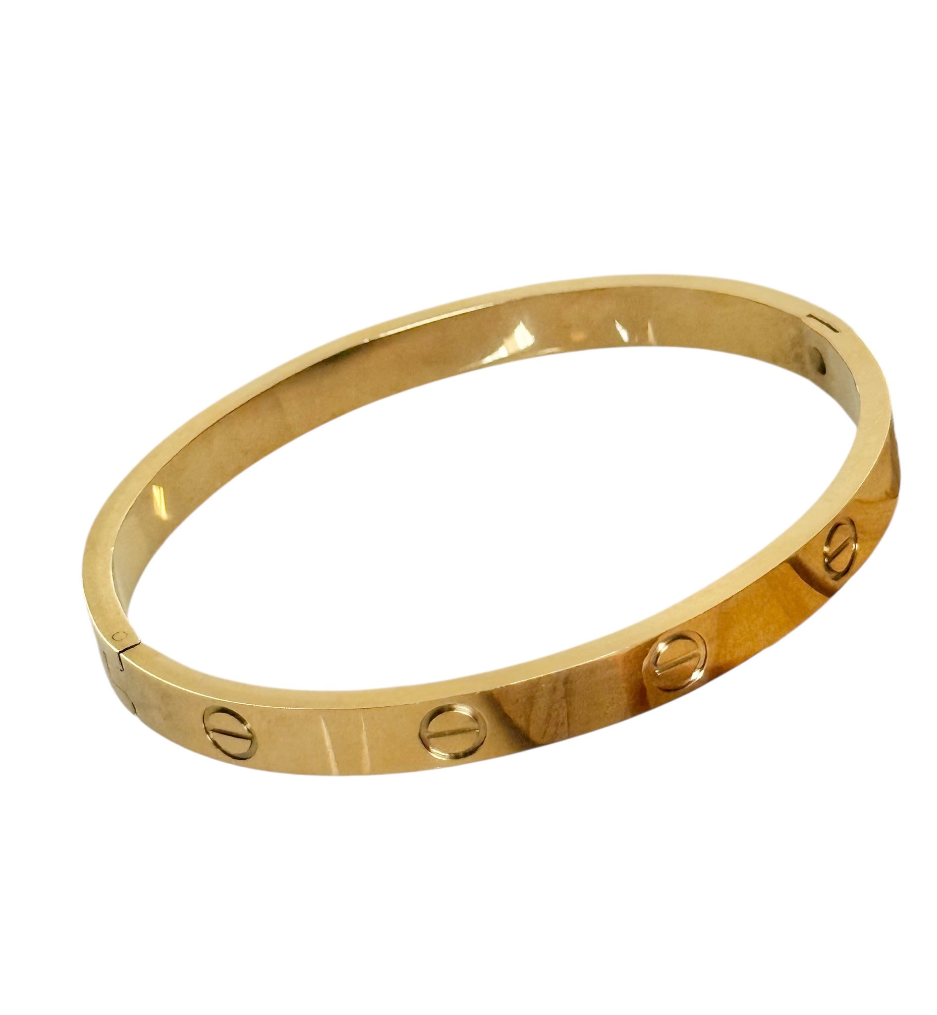 A sleek Cartier-inspired fashion bangle designed with iconic screw-detail accents for a bold yet timeless look. Crafted with a non-tarnish gold-tone finish, this bracelet delivers everyday luxury without the high-maintenance care. Its structured silhouette makes it perfect for stacking or wearing solo as a statement piece.