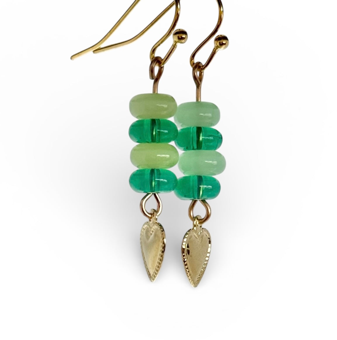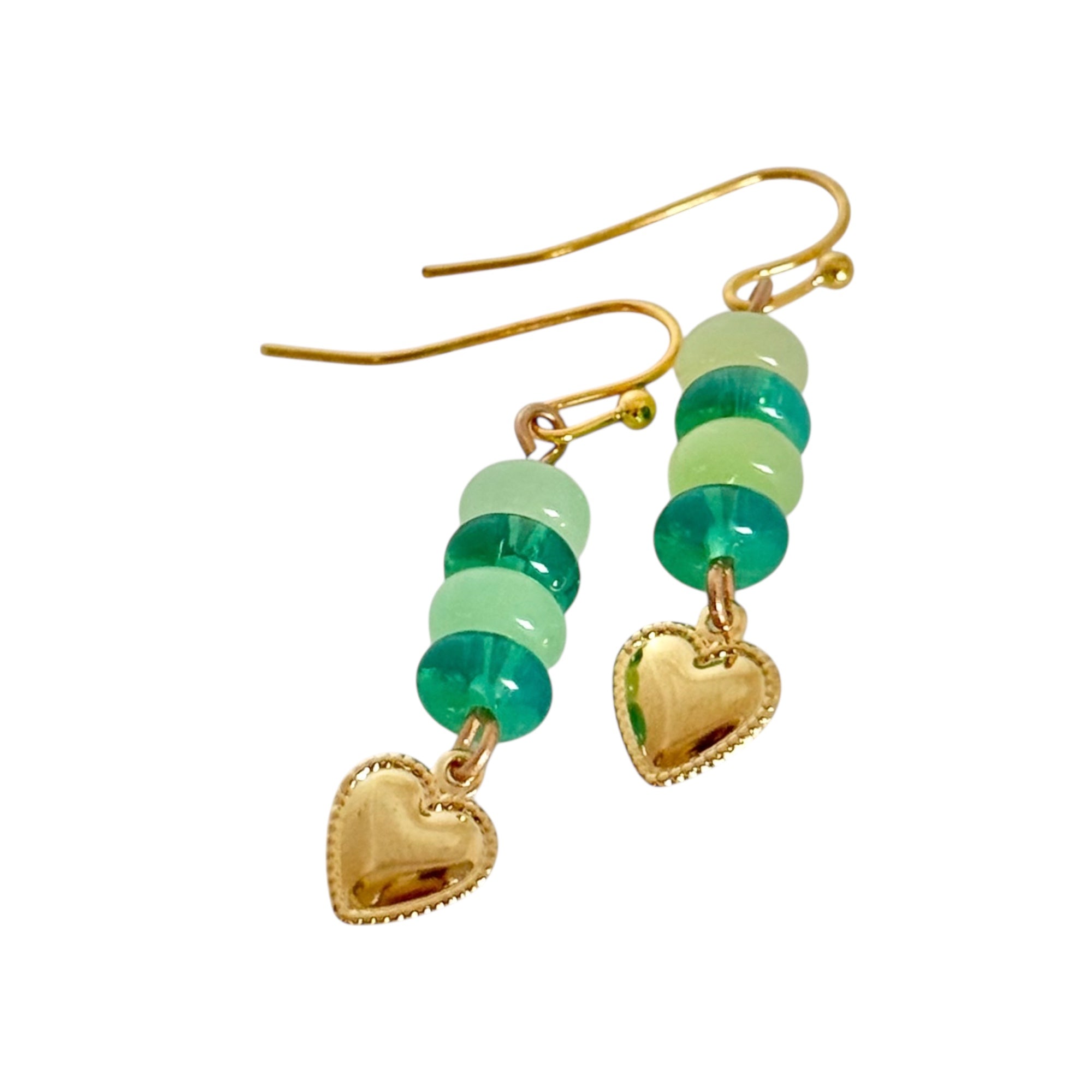 Let your style shimmer with Emerald Heart Dangle Earrings, a playful yet elegant blend of charm and color. Featuring alternating green and mint beads stacked in harmony, these earrings are finished with delicate gold heart charms that add a soft romantic touch.
