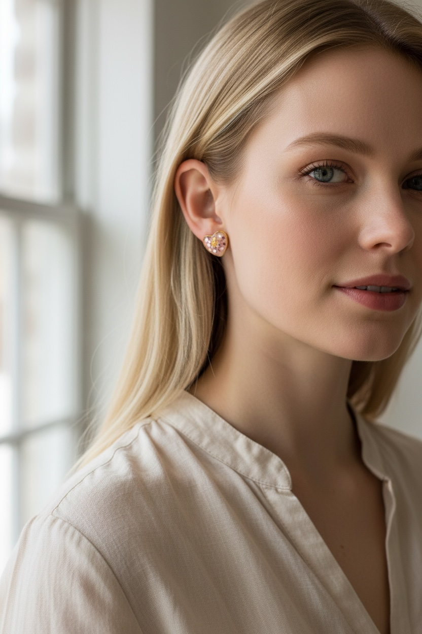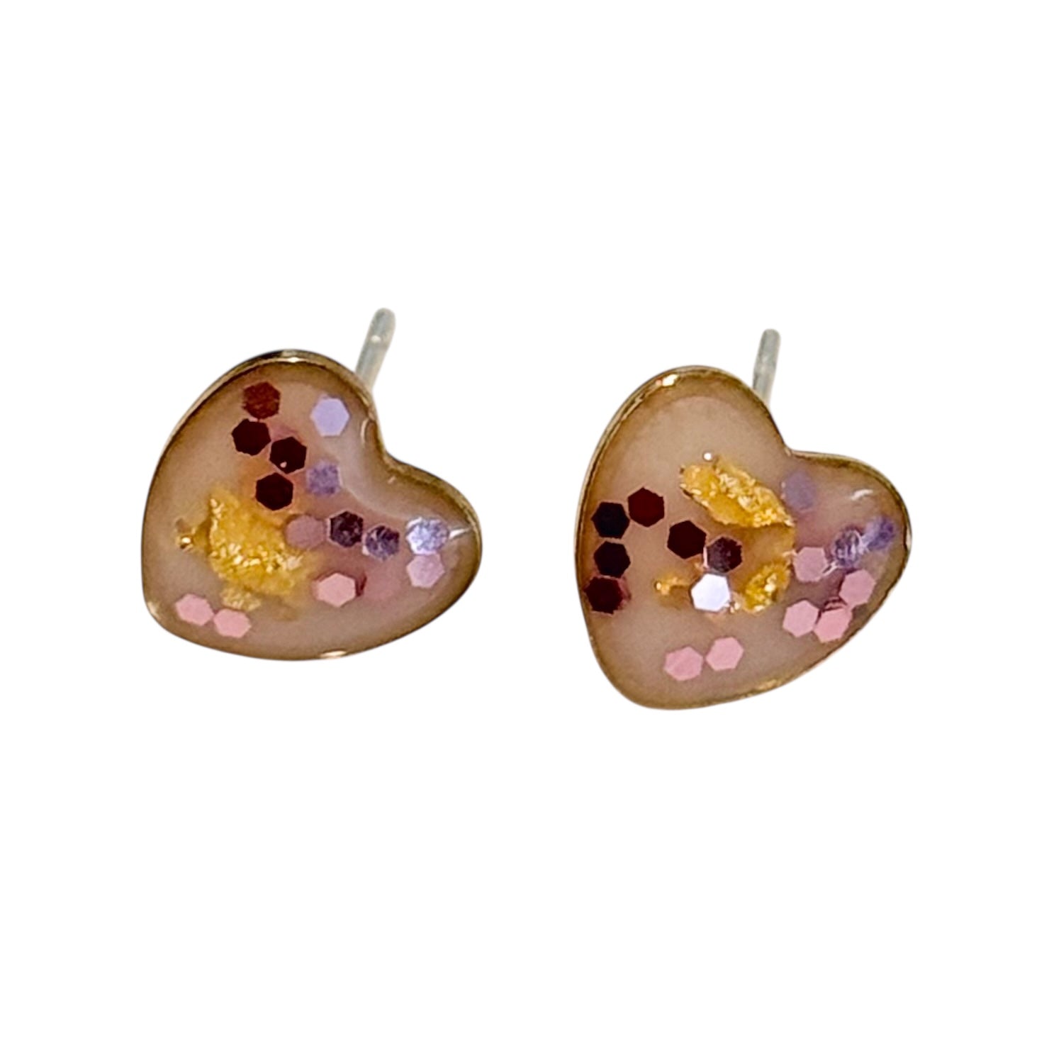 Sweet and sparkly handmade heart stud earrings, decorated with shimmering foil and sealed in glossy epoxy resin for a smooth, glowing finish.