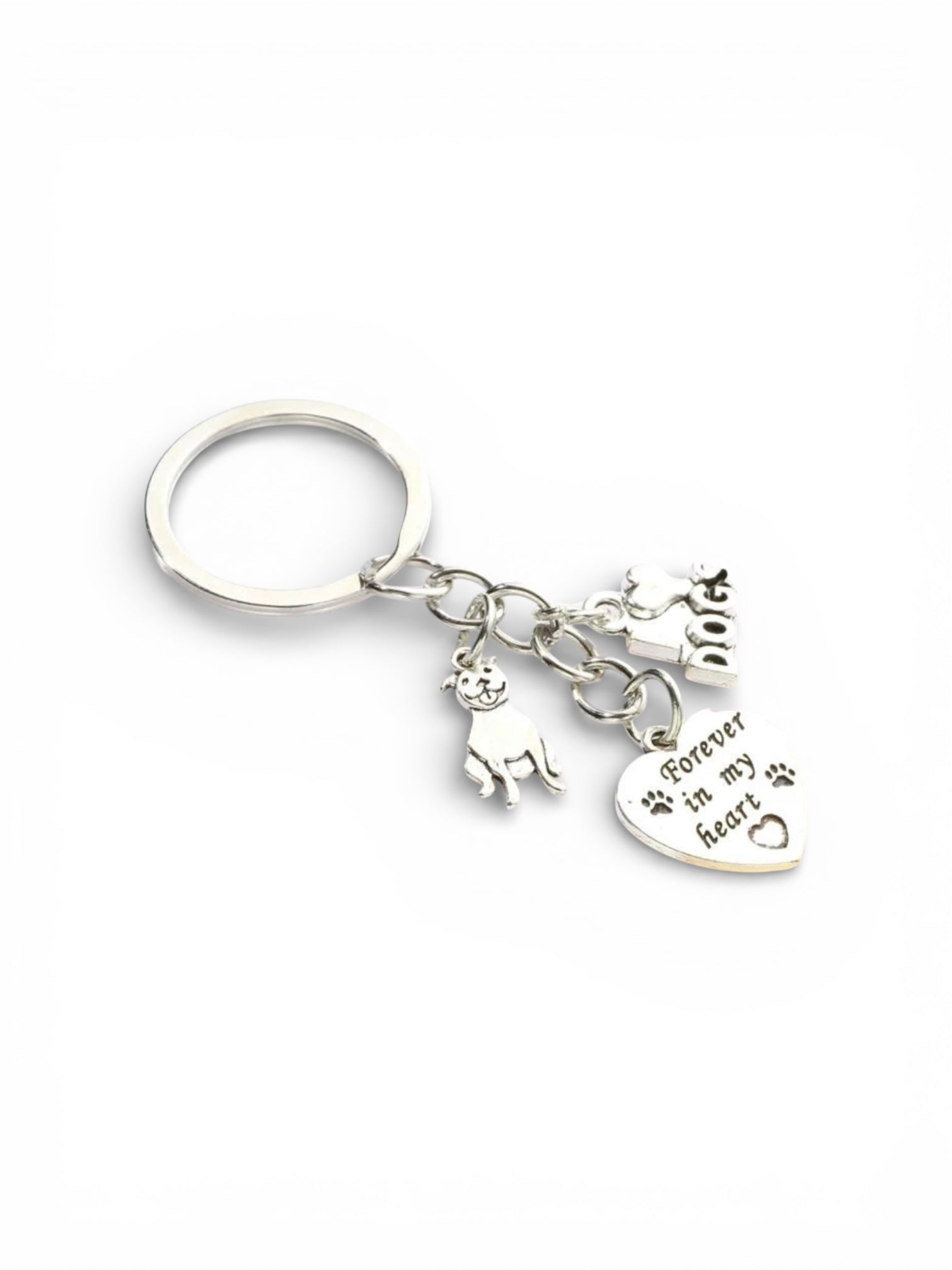 Celebrate the unconditional love of dogs with the Forever in My Heart Dog Lover Keychain. Crafted from zinc alloy in a classic silver finish, this charming keychain features meaningful dog-themed charms, including a heart engraved with “Forever in my heart” and a sweet “I ❤️ Dogs” accent. A thoughtful keepsake for dog lovers, pet parents, or as a sentimental gift to remember a furry friend always close to your heart.