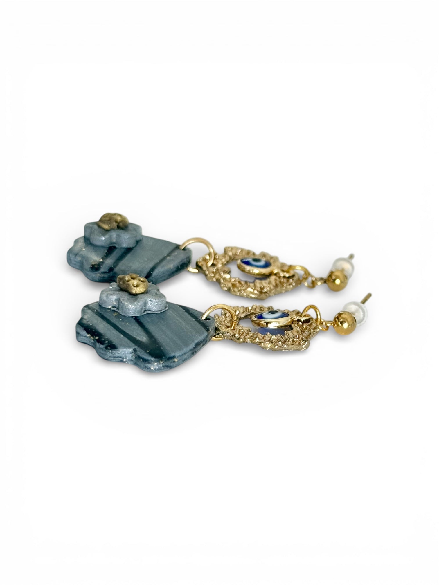 The Guardian Bloom Evil Eye Earrings are beautifully handmade to combine symbolism, texture, and modern elegance. Crafted from polymer clay in a stone-grey marbled finish with delicate floral detailing, each piece is paired with a gold-tone evil eye charm, believed to offer protection and positive energy. Finished with brass accents and stainless steel studs for comfort and durability, these earrings are both meaningful and stylish.
