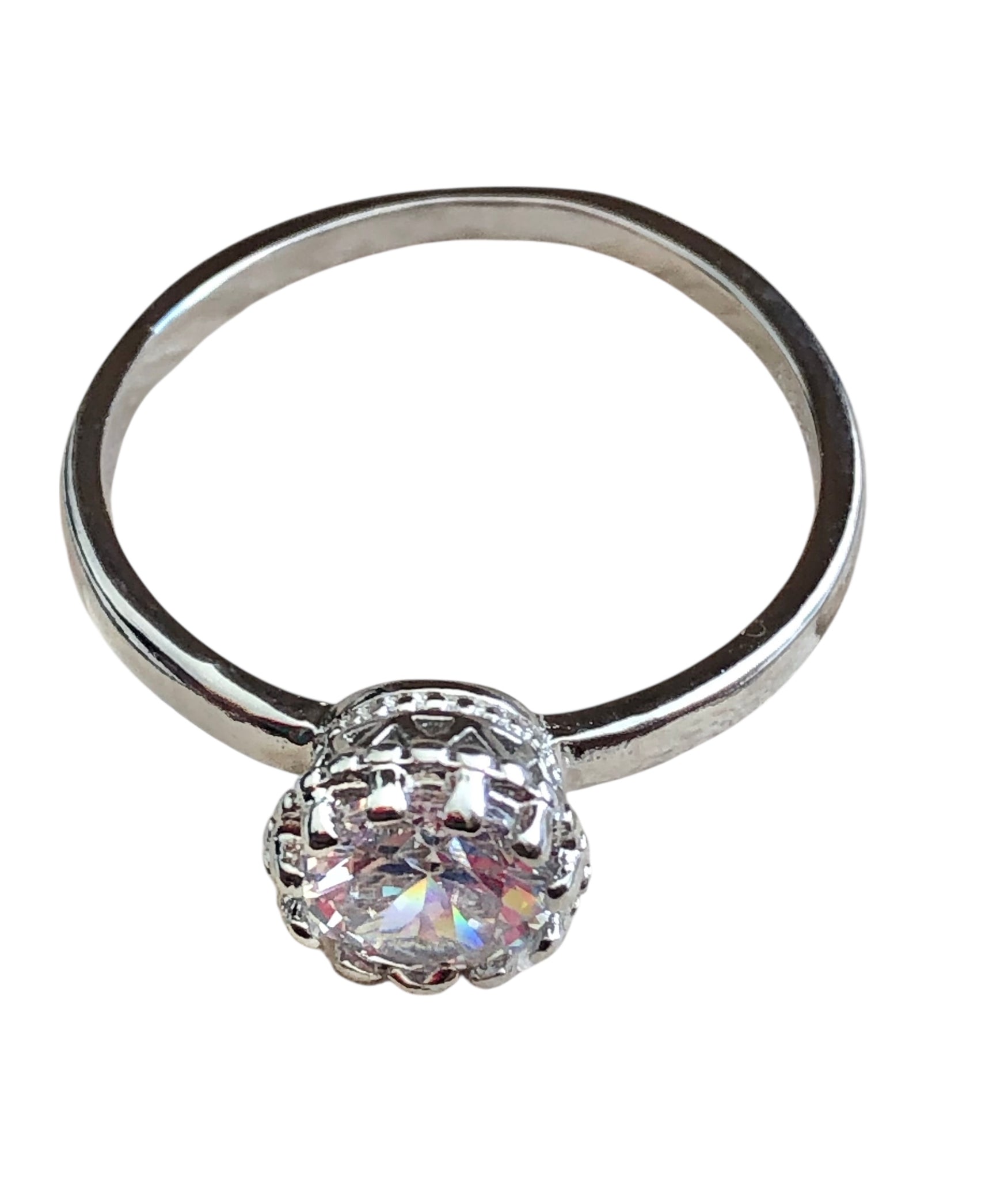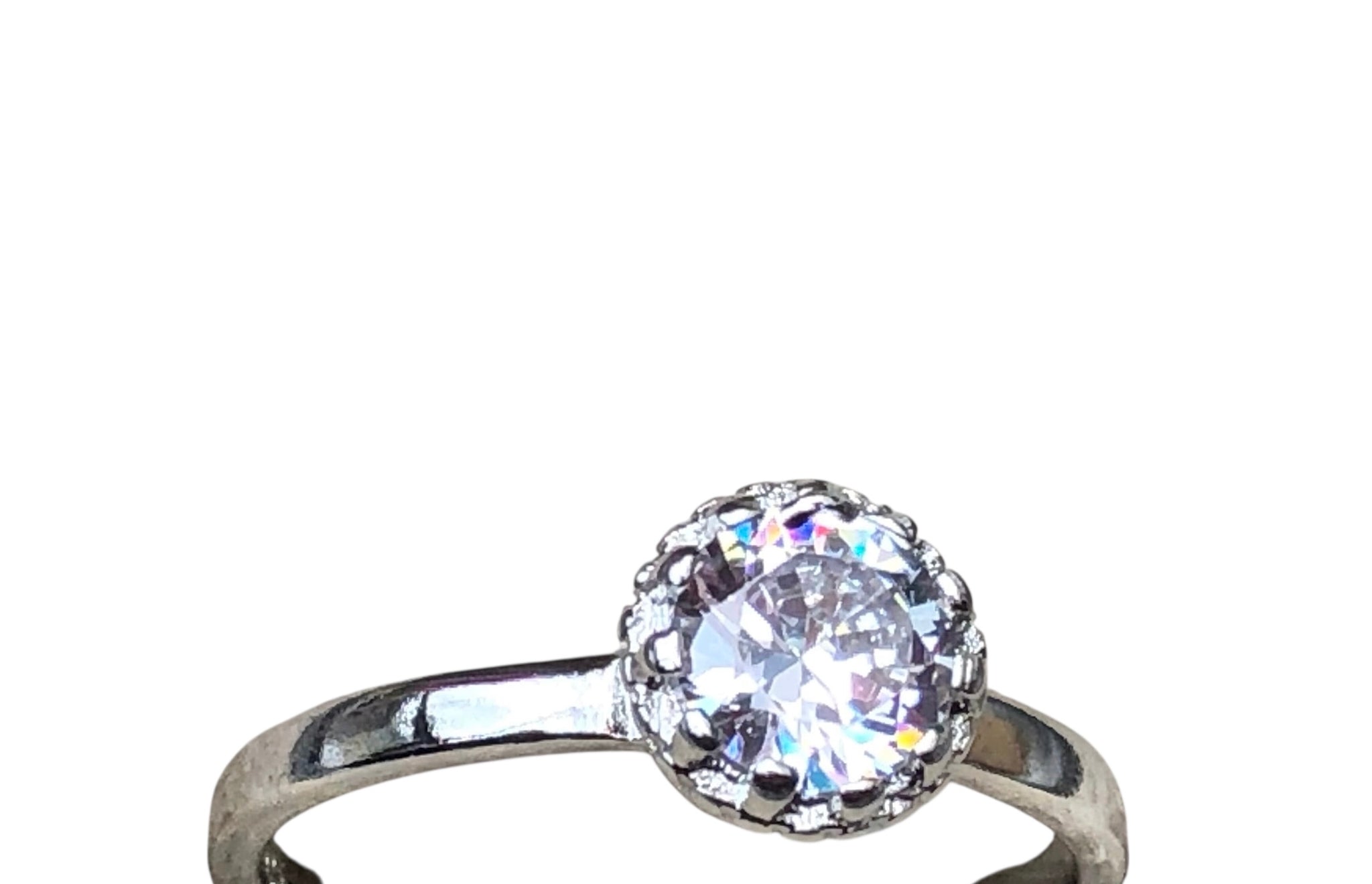 A timeless 925 sterling silver fashion engagement ring featuring a brilliant round-cut cubic zirconia that captures light with stunning clarity and sparkle. Set in a classic prong design with delicate detailing, this elegant piece offers the look of luxury while remaining lightweight and comfortable for everyday wear or special occasions.
