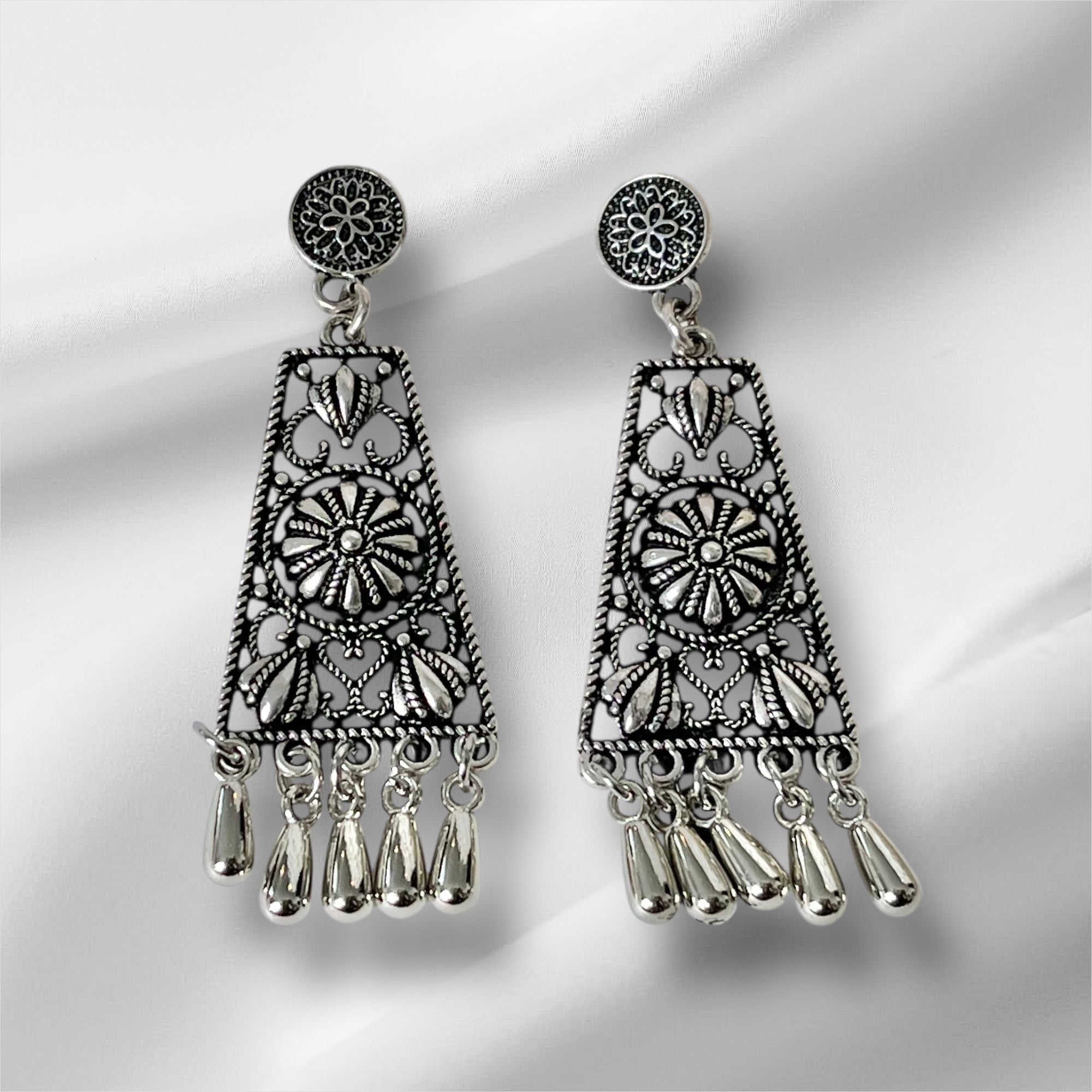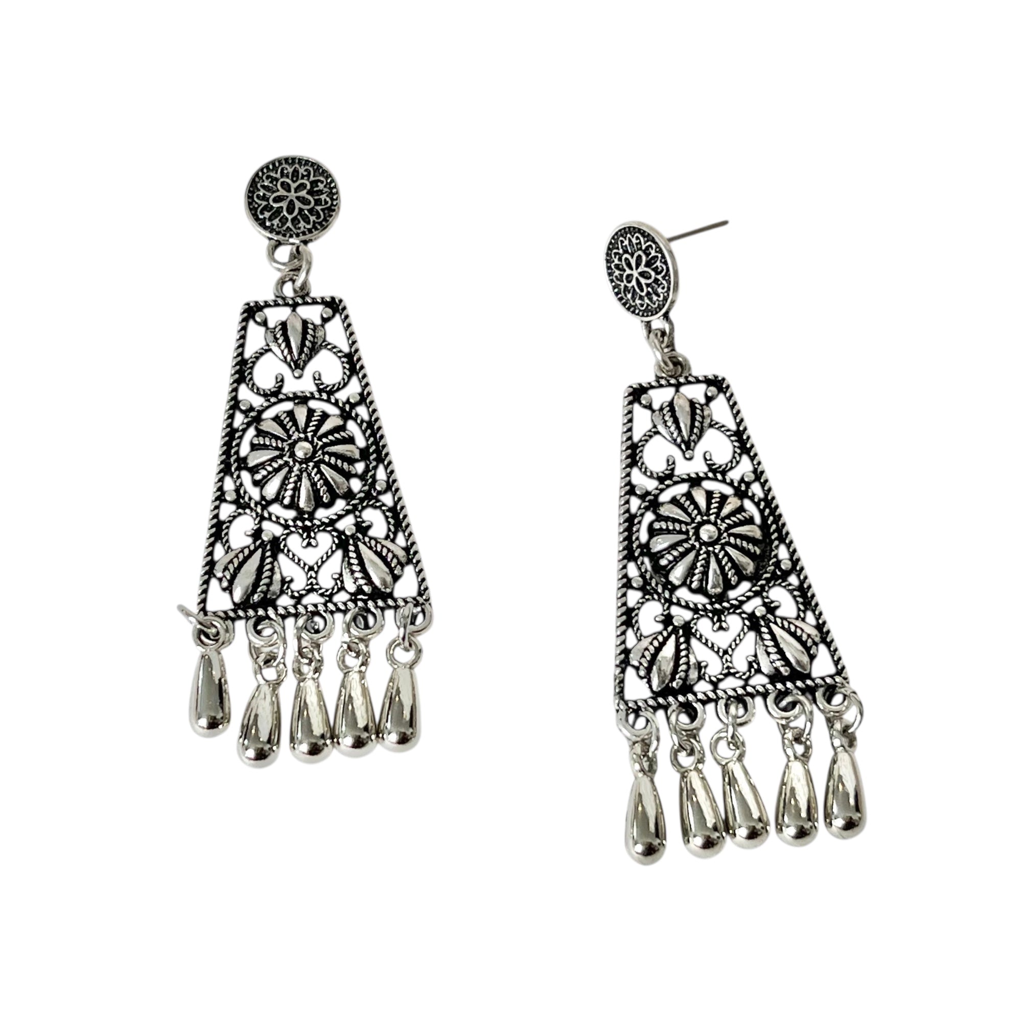 Add a touch of vintage charm to your look with these Antique Bloom Tassel Drop Earrings. Designed in an elegant antique silver finish, they feature intricate floral and filigree detailing paired with delicate dangling drops that create graceful movement with every step. Crafted from zinc alloy, these earrings are lightweight yet striking, perfect for both everyday wear and special occasions.