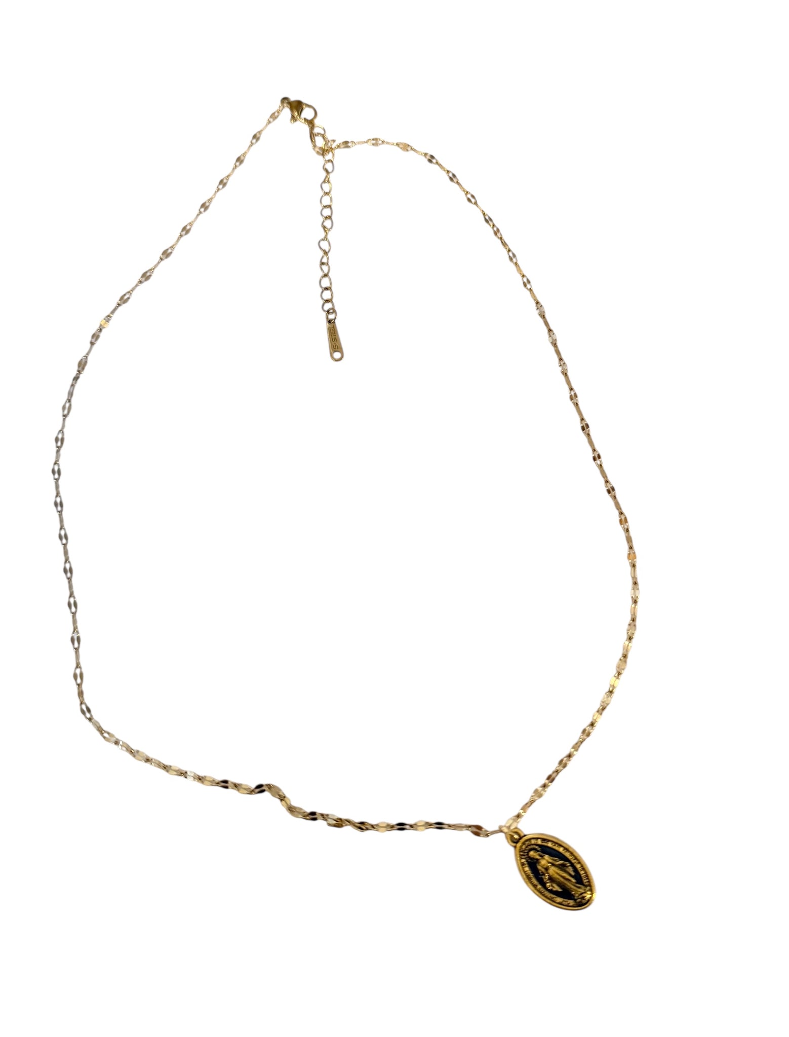 A delicate handmade stainless steel necklace featuring a sleek gold-tone chain and an elegant oval medallion pendant with a timeless faith-inspired design. Lightweight, non-tarnish, and perfect for everyday wear or layering, this piece adds a soft glow of elegance and meaning to any outfit.