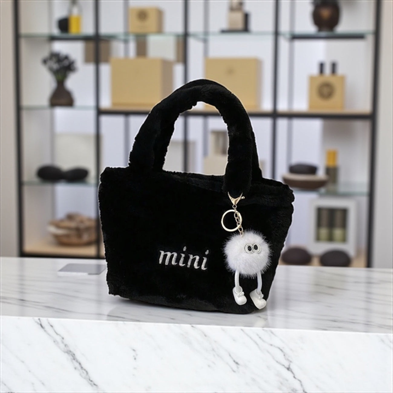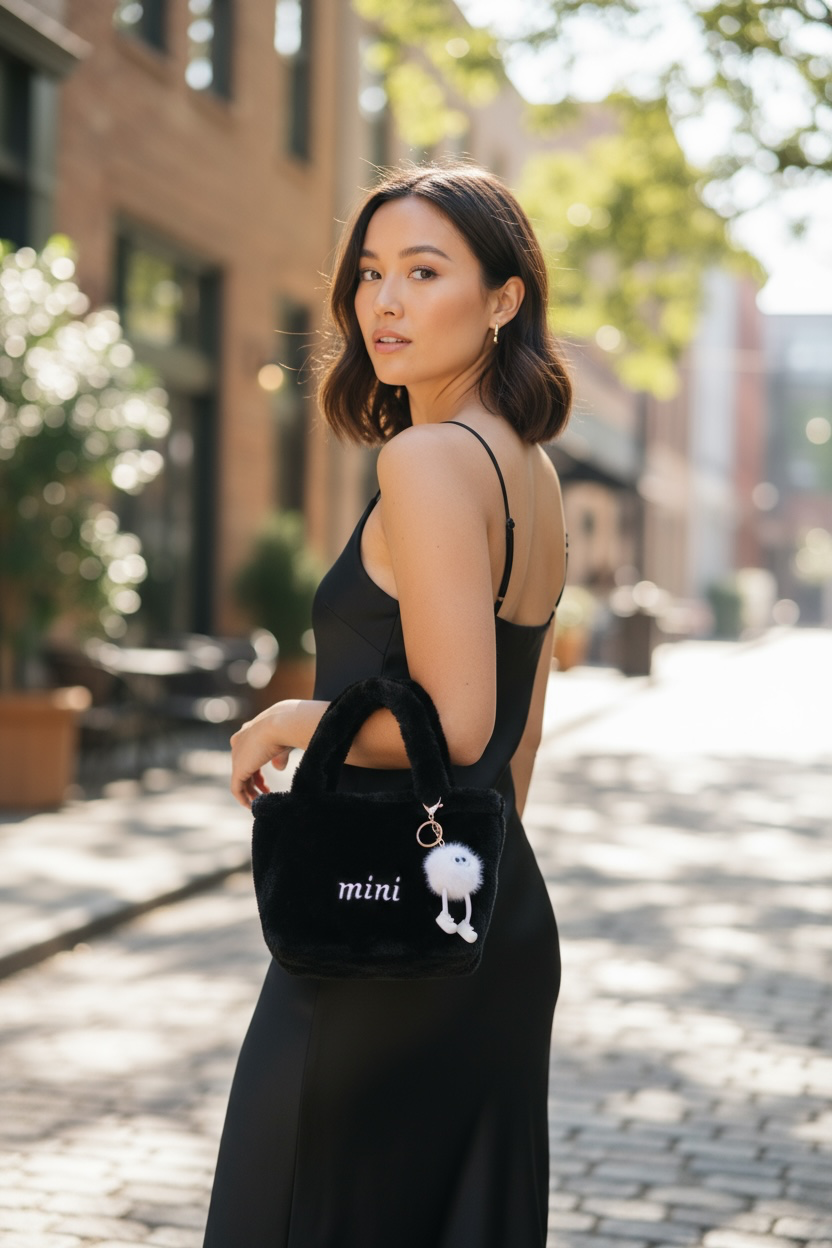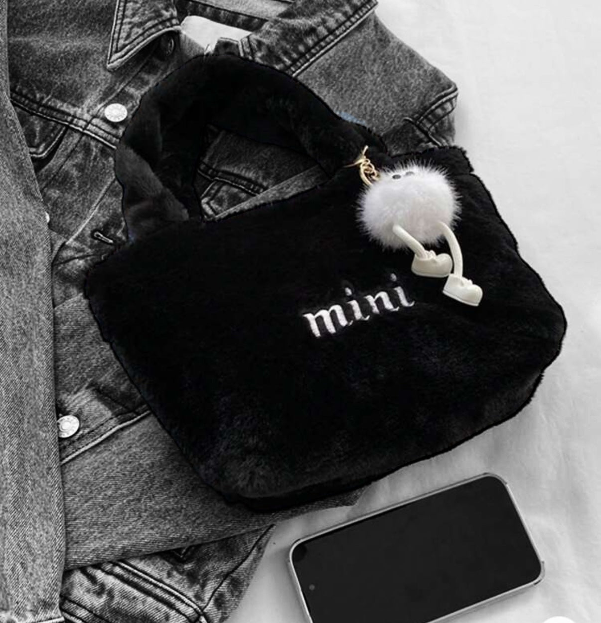 The Mini Fuzz handbag combines playful texture with cozy sophistication. Crafted from ultra-soft faux fur, this petite black tote is both stylish and functional, perfect for carrying daily must-haves like your wallet, keys, and lip gloss.