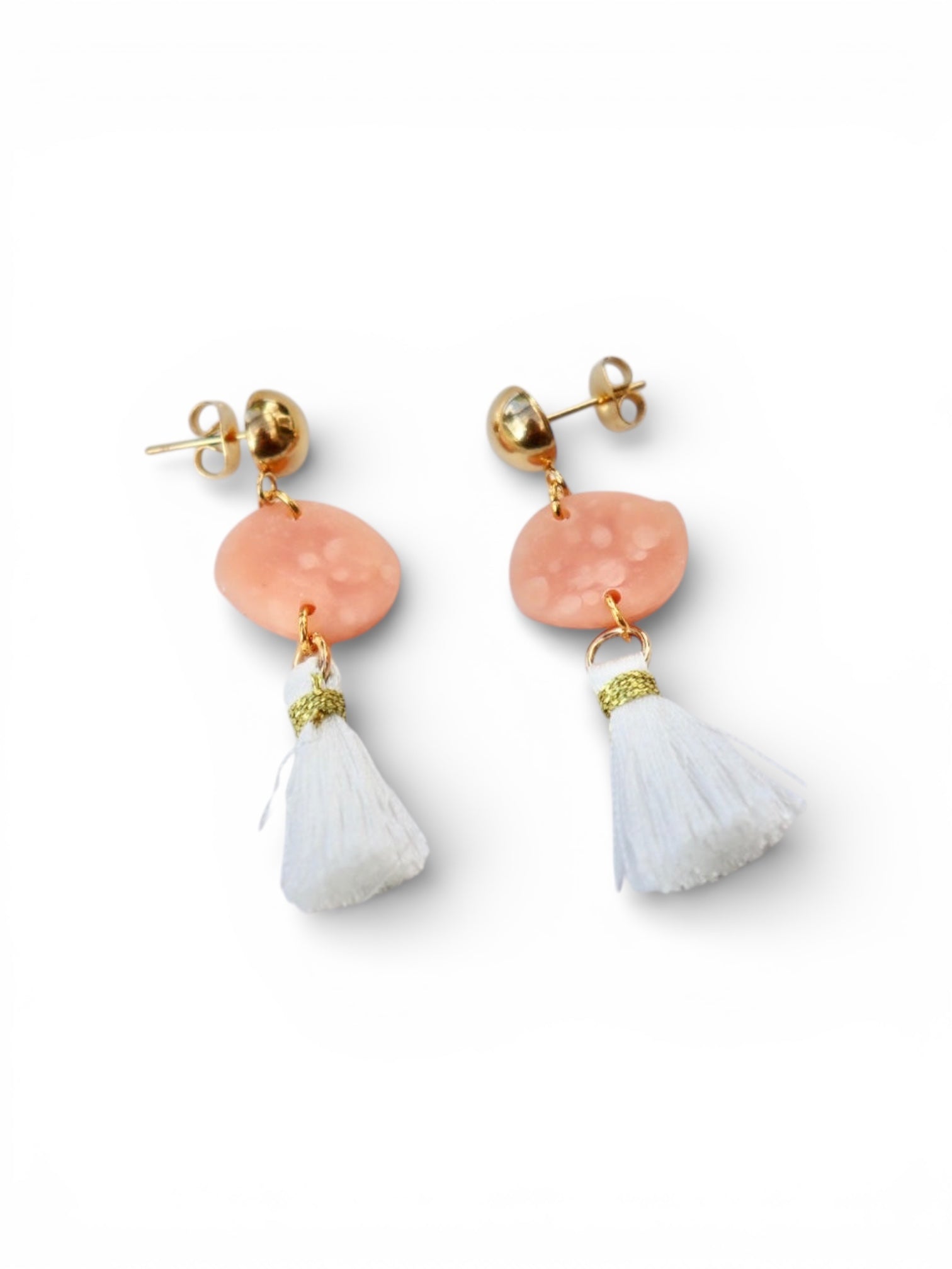 The Peach Whisper Tassel Earrings are delicately handmade to capture soft elegance and effortless charm. Featuring blush-peach polymer clay with a subtle speckled finish, paired with flowing white tassels, these earrings bring gentle movement and a light, airy feel. Finished with stainless steel studs for comfort and everyday wear, they’re perfect for adding a fresh, feminine touch to any outfit.