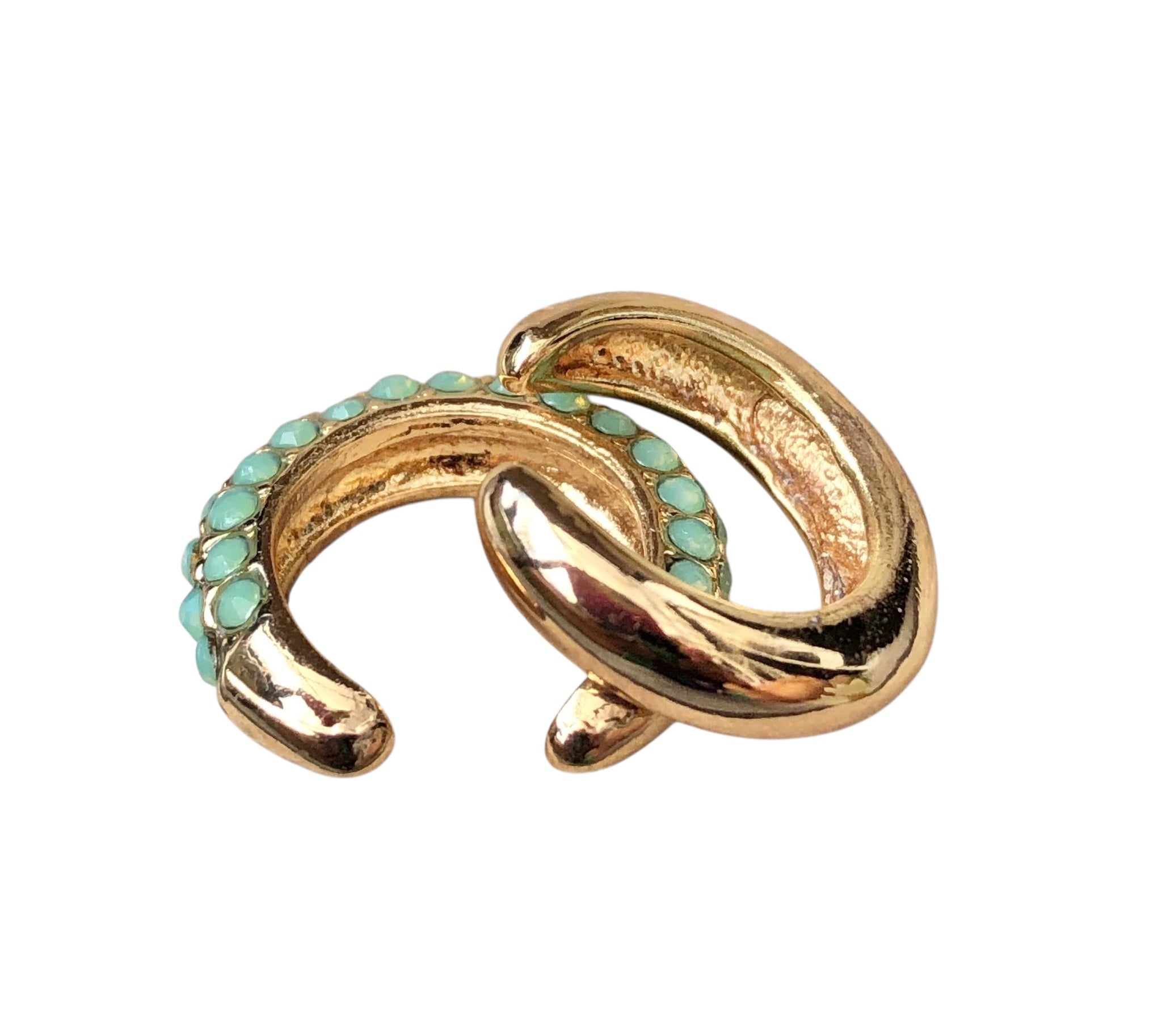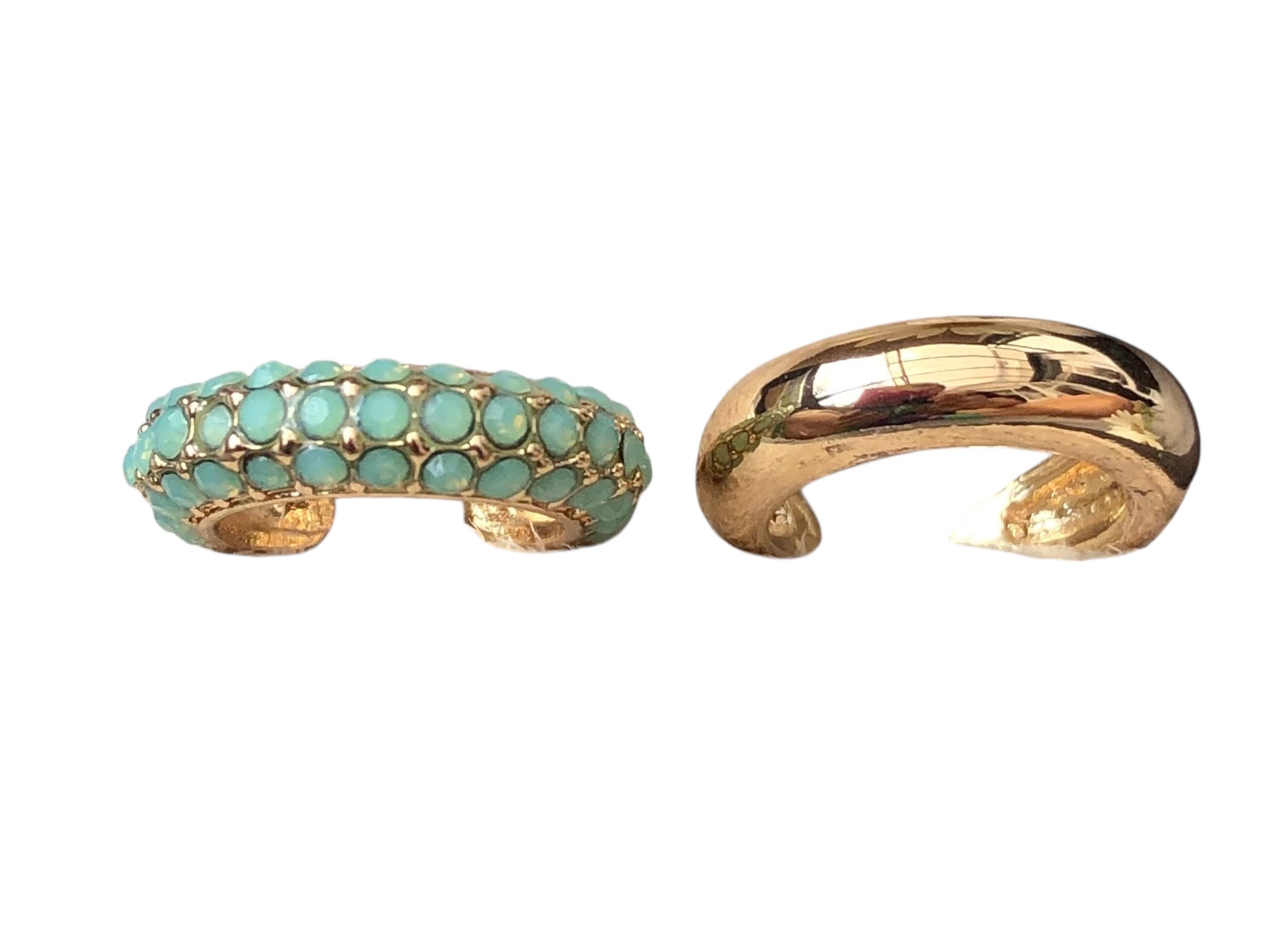 Add instant edge to your look with these stylish clip-on earcuffs, designed for effortless wear—no piercing required. Crafted from gold-tone zinc alloy and accented with mint-green stones, this pair brings a fresh pop of colour with a modern, layered illusion. Perfect for stacking or wearing solo, these earcuffs elevate everyday outfits with minimal effort and maximum style.