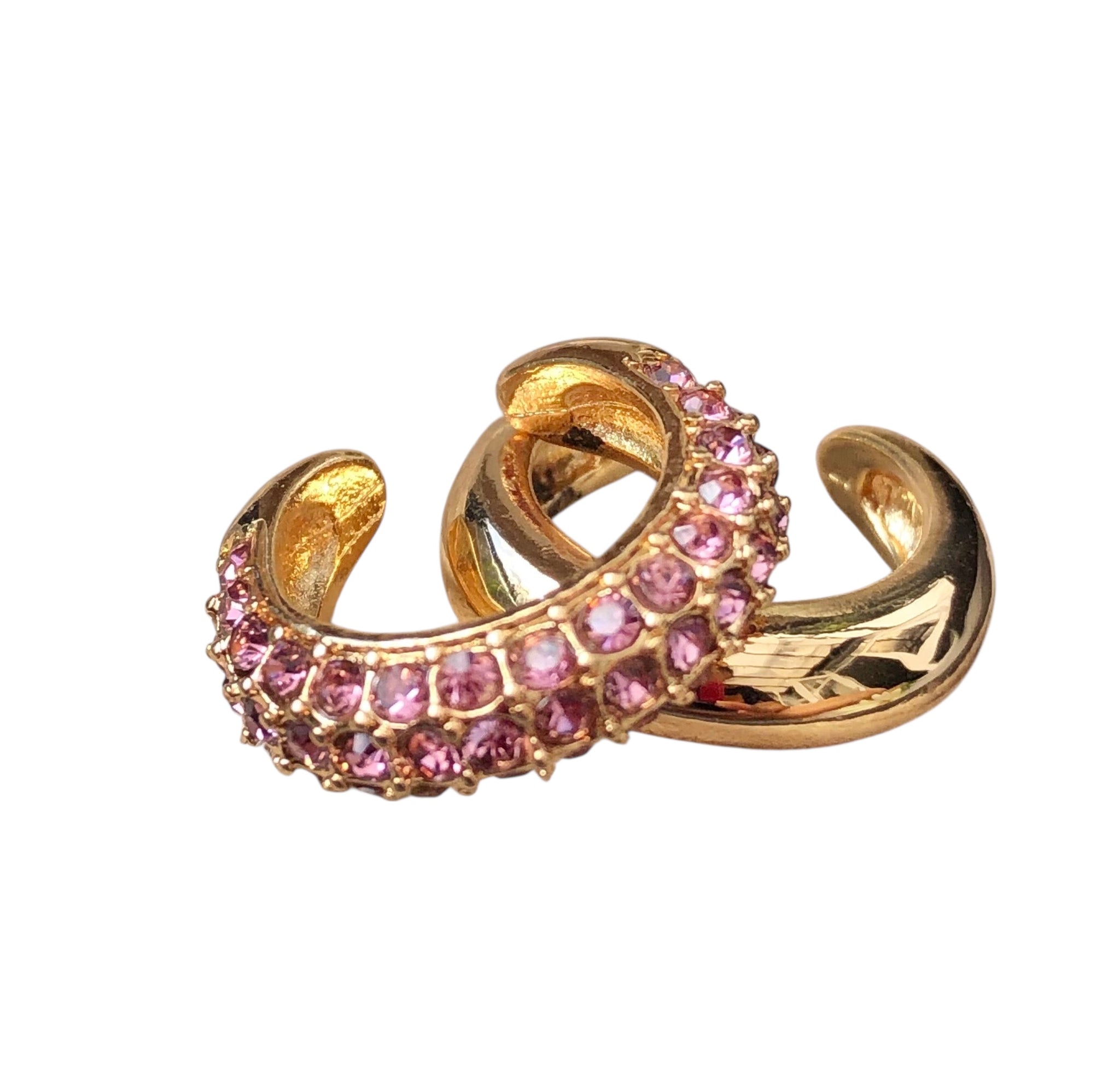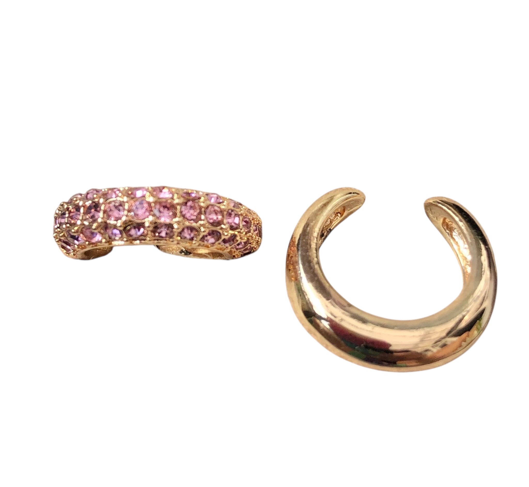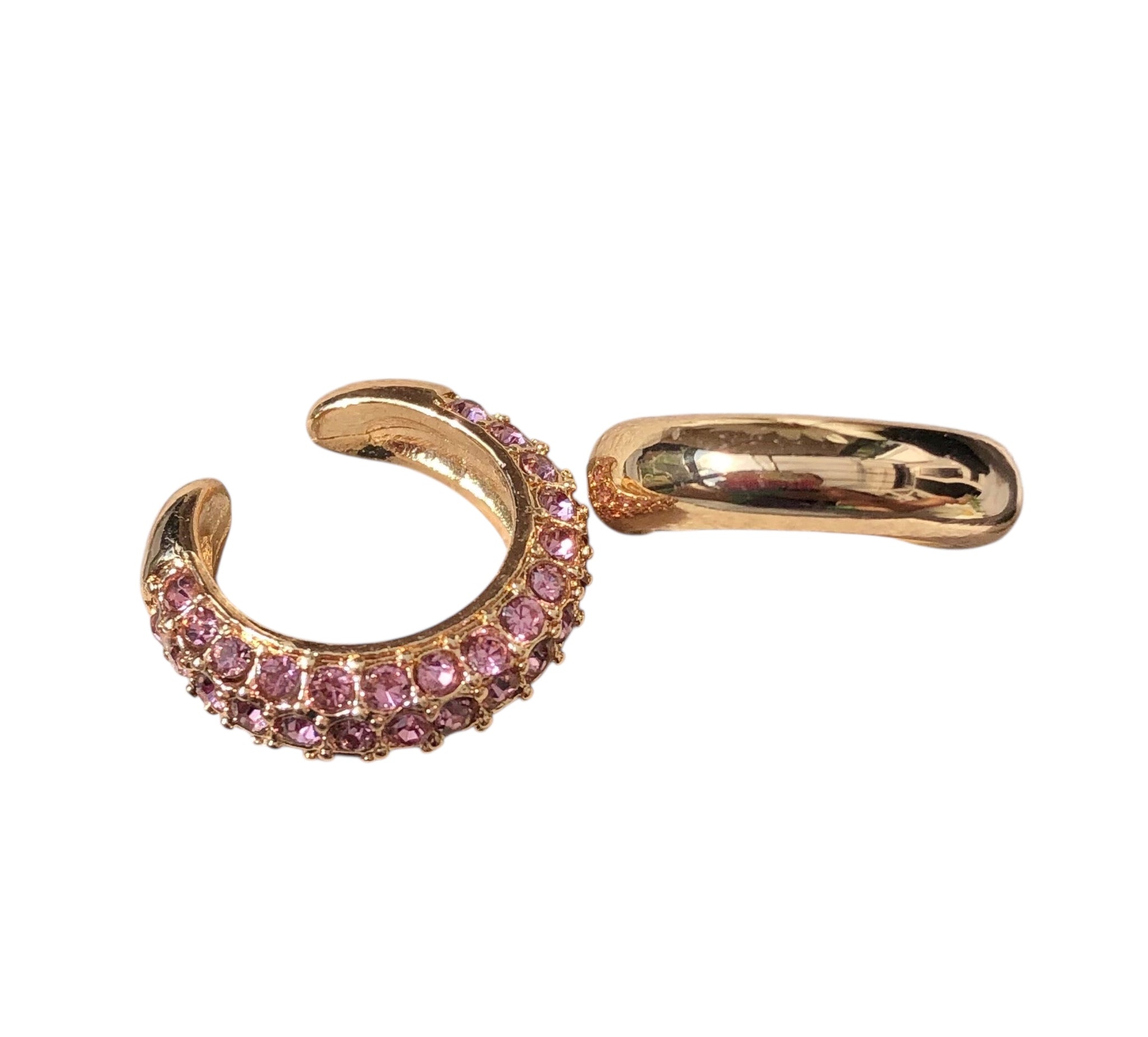 Turn up the glam with these sparkling clip-on earcuffs, designed to elevate your look without the need for piercings. Crafted from gold-tone zinc alloy and encrusted with soft pink crystal accents, this pair creates a layered, statement effect with effortless wear. Chic, bold, and lightweight, perfect for nights out or adding instant polish to everyday outfits.
