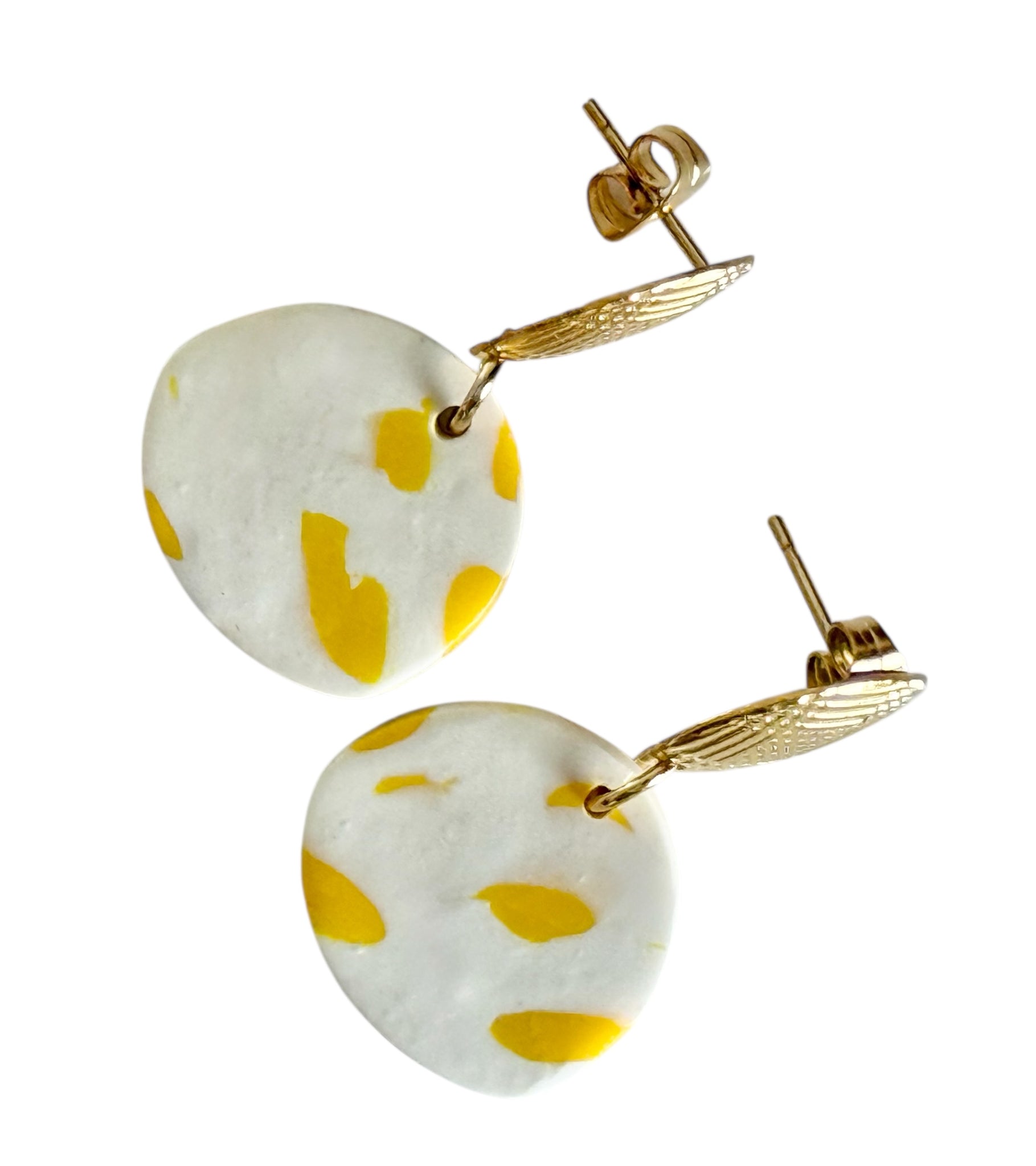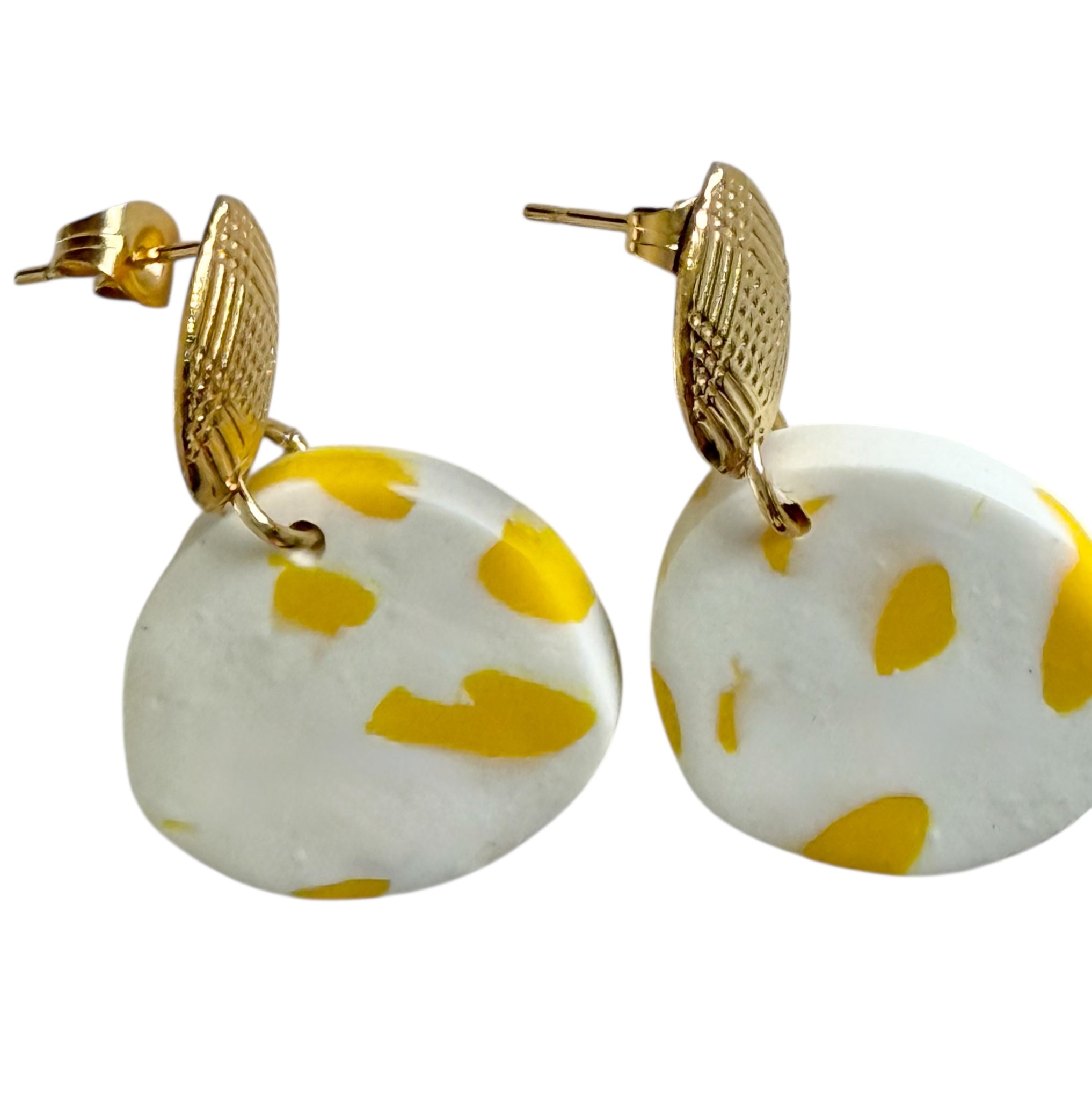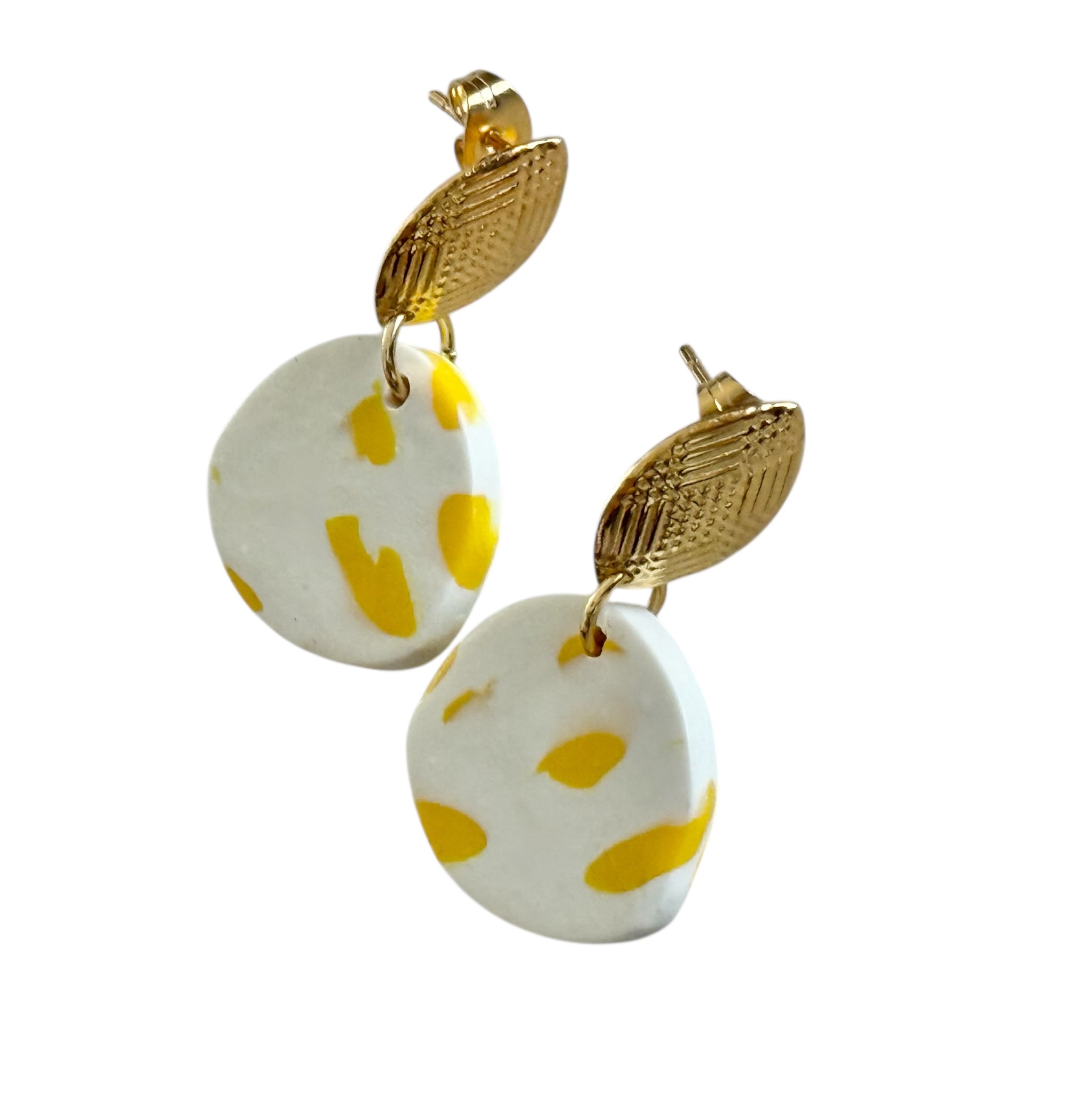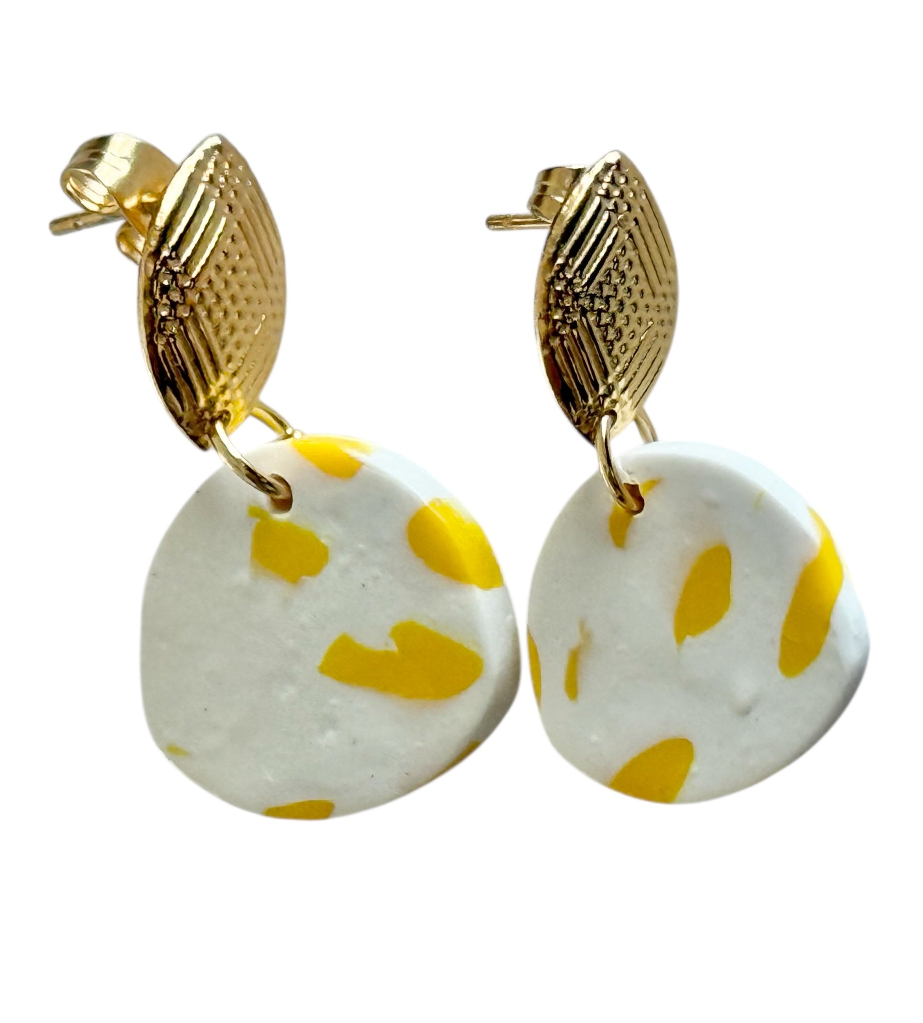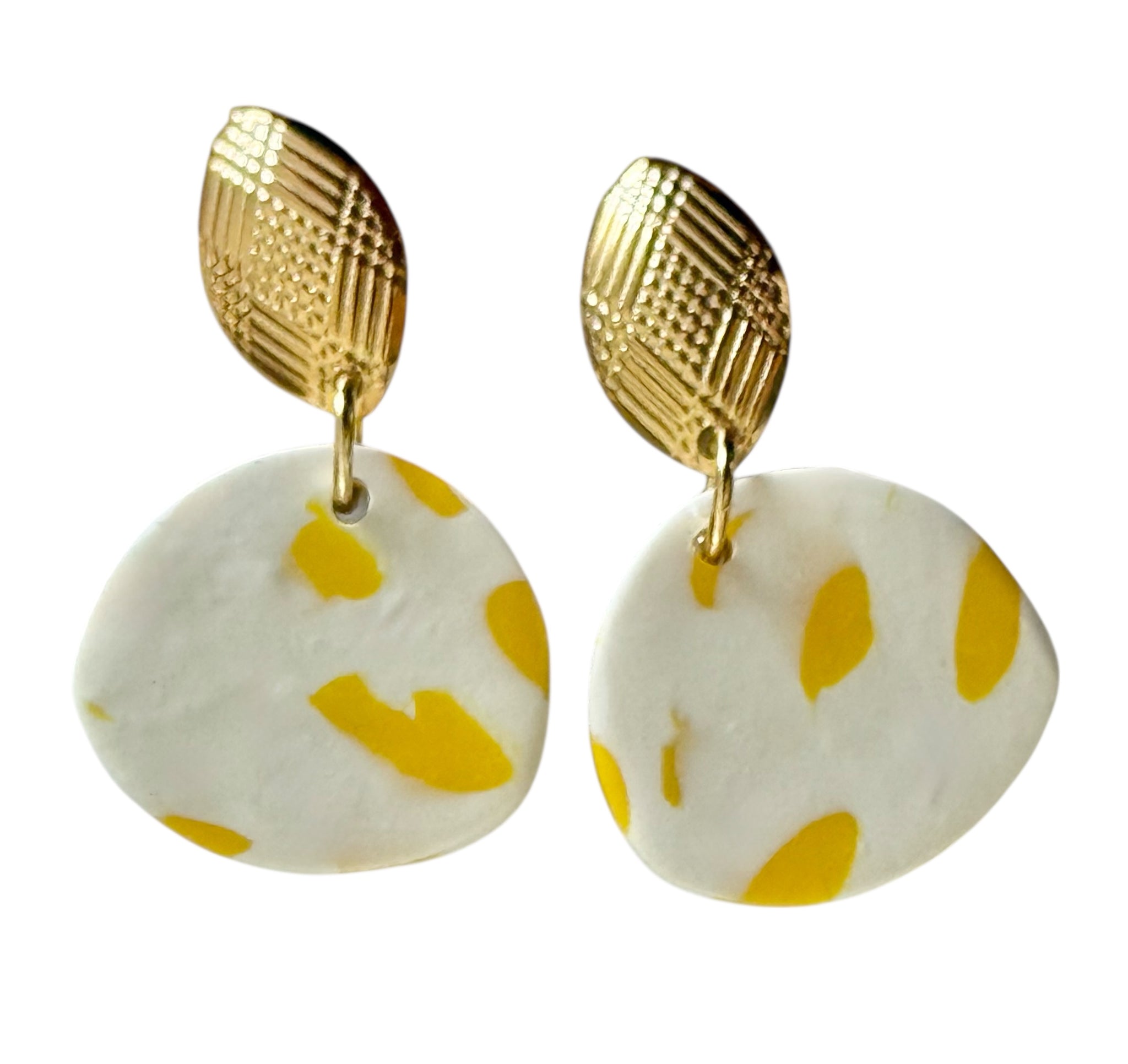 Handmade polymer clay earrings featuring a soft white base with playful yellow accents, paired with textured gold-tone detailing. Lightweight and eye-catching, these earrings add a fresh pop of colour while remaining comfortable for all-day wear. Finished with stainless steel posts, making them suitable for sensitive ears.