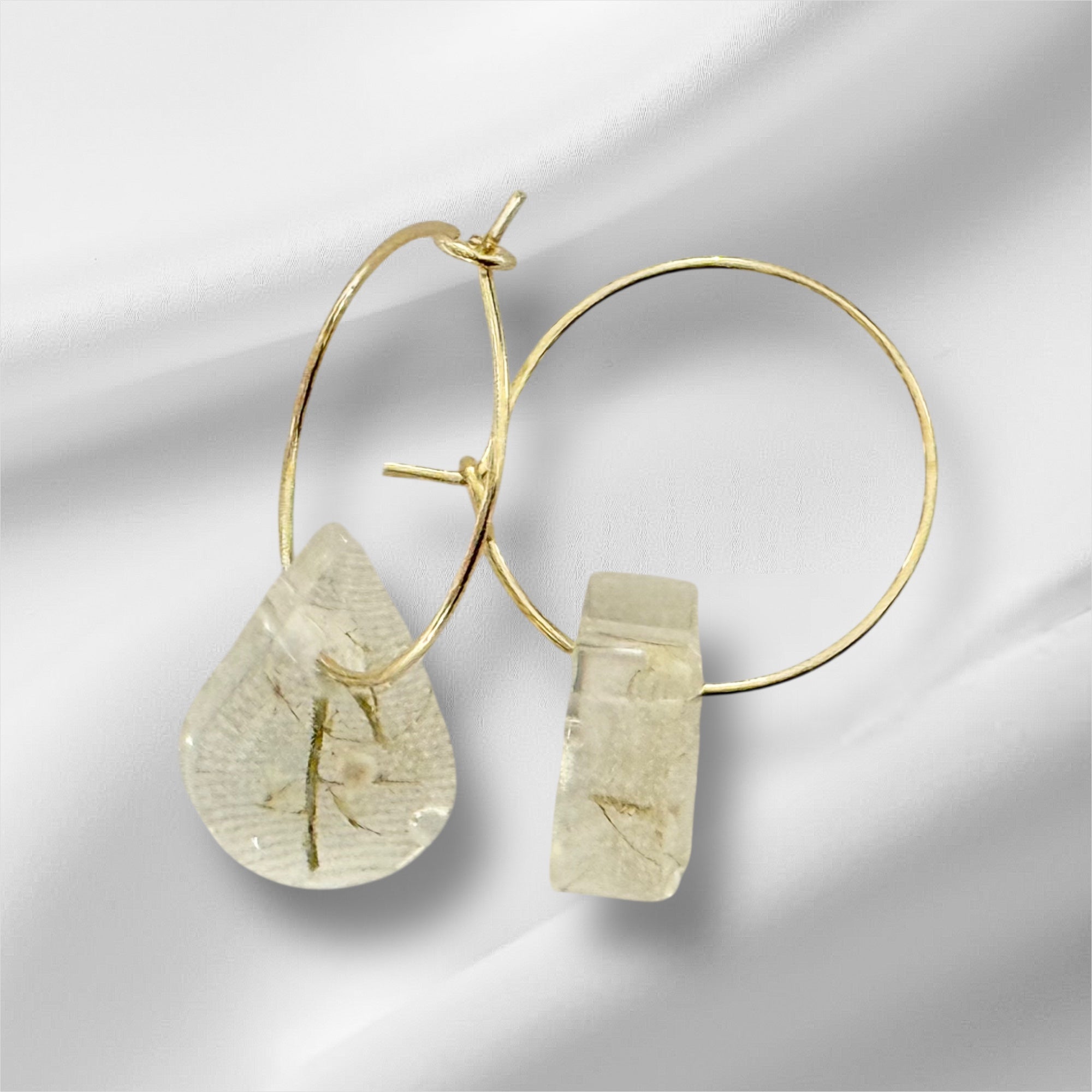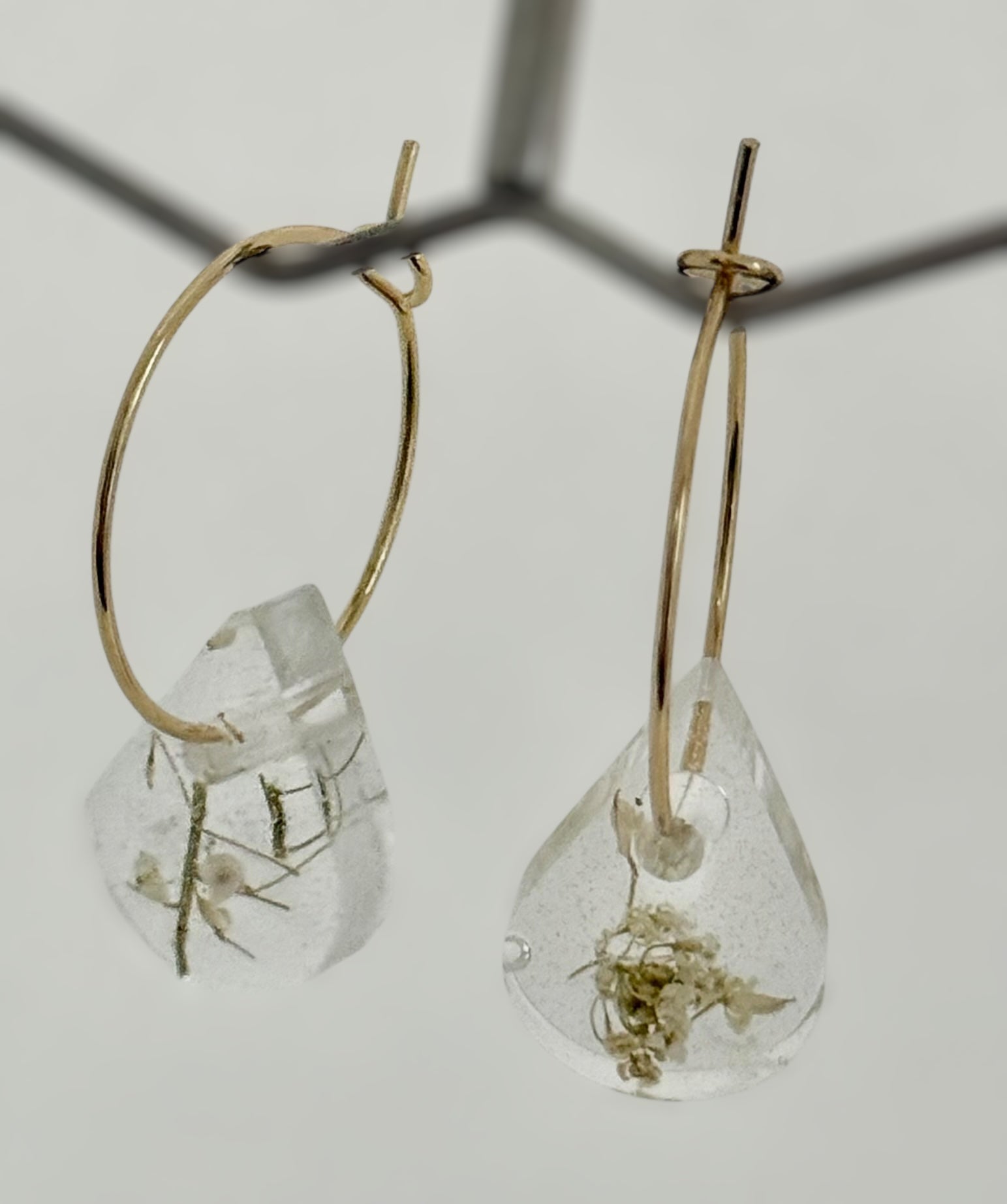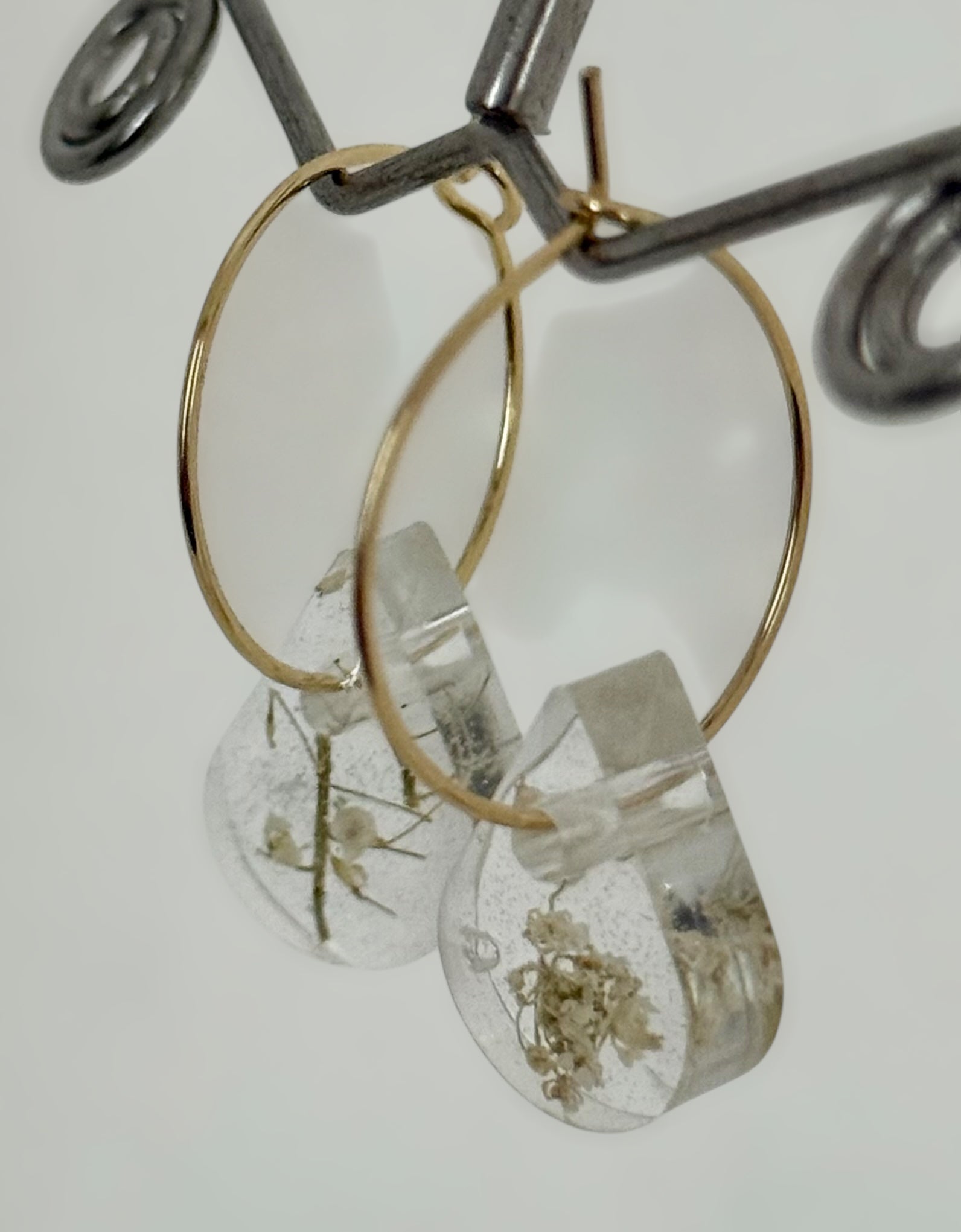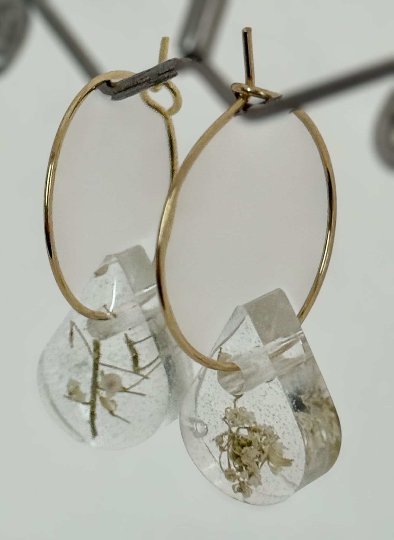 Description: Handmade teardrop earrings with dried wild white flowers preserved in resin, hanging from stainless steel hoops.