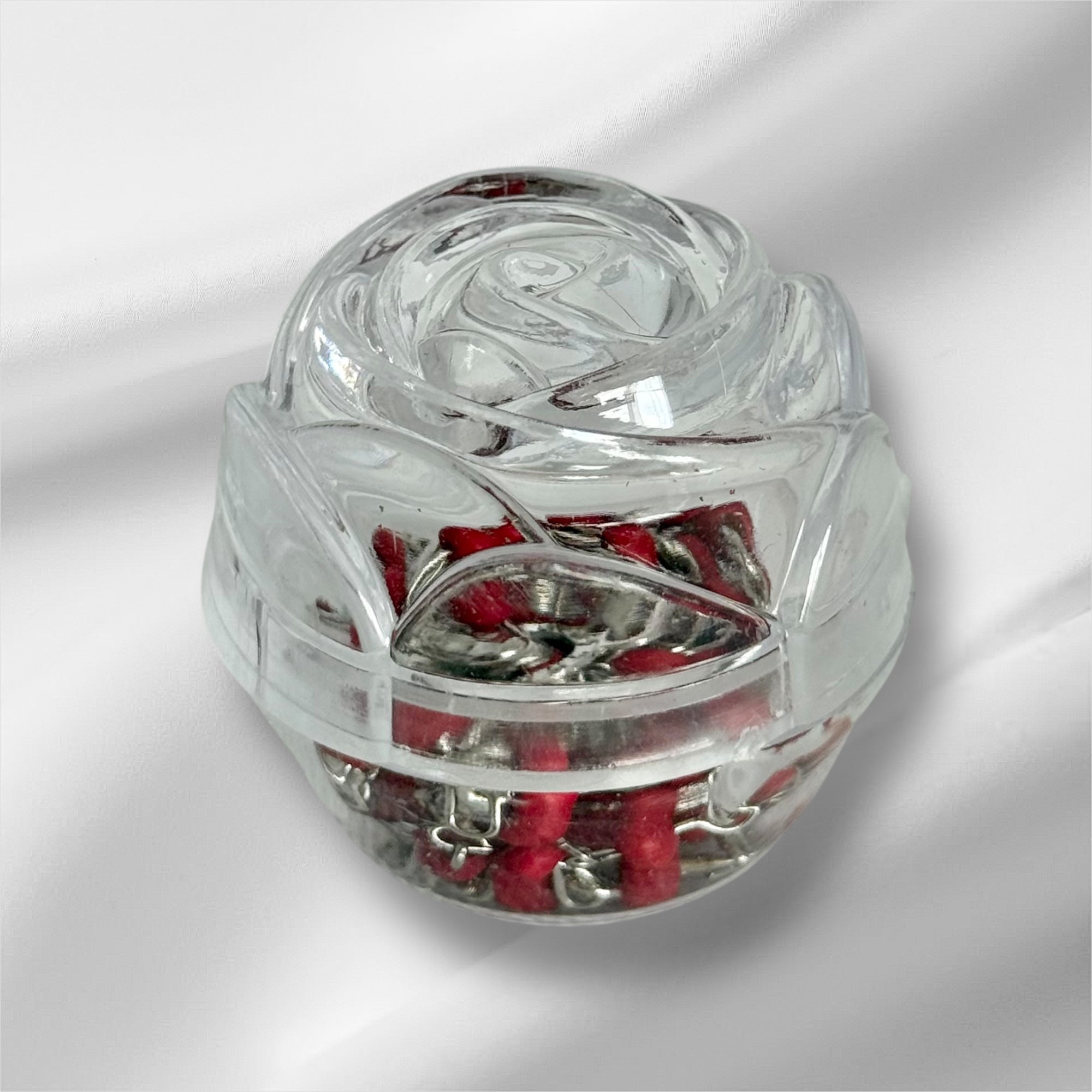 It comes elegantly encased in a clear rose-shaped box. A gentle symbol of purity and faith, perfect for gifting or personal prayer.